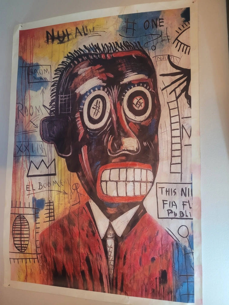 Jean Michel Basquiat's Untitled work on smooth canvas from 1982. Some coloration on bottom right ( as in picture) but is hardly noticeable when on wall and can't be seen if in a frame. roughly 86cm x 123cm. pick up is Bathurst and Bloor