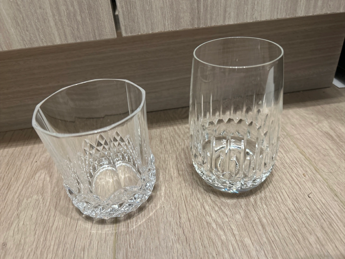 crystal drinking glasses. The glass on the left appears to have a slanted design, while the glass on the right has a simple, straight design. 2.50 EACH