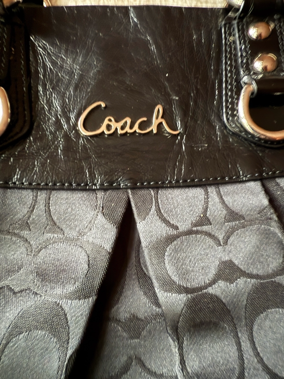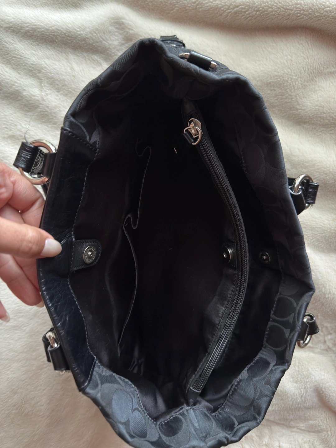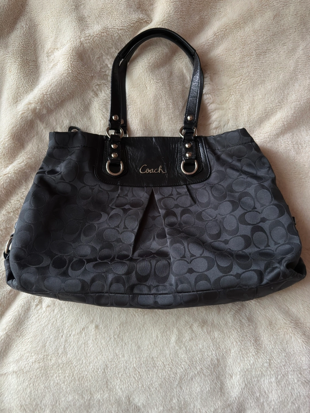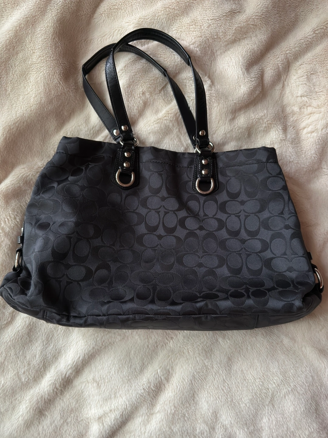 Black Coach handbag with silver accents. Features handles and silver rings. Inside with a zippered pocket and a few compartments. A perfect everyday item for your busy lifestyle.