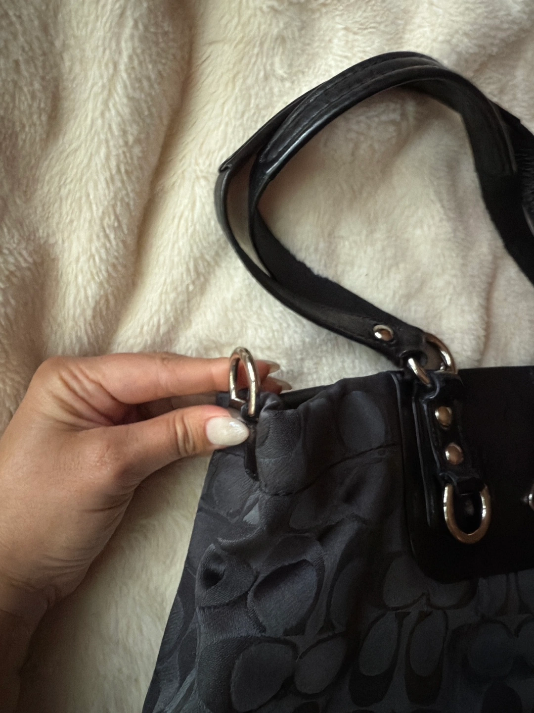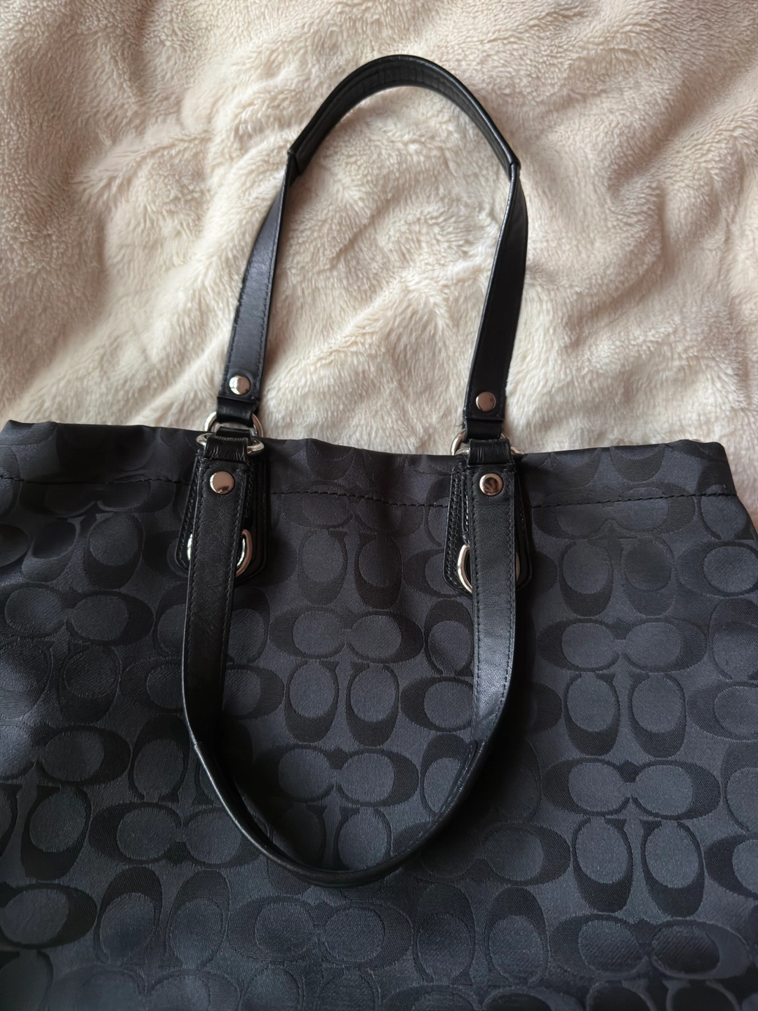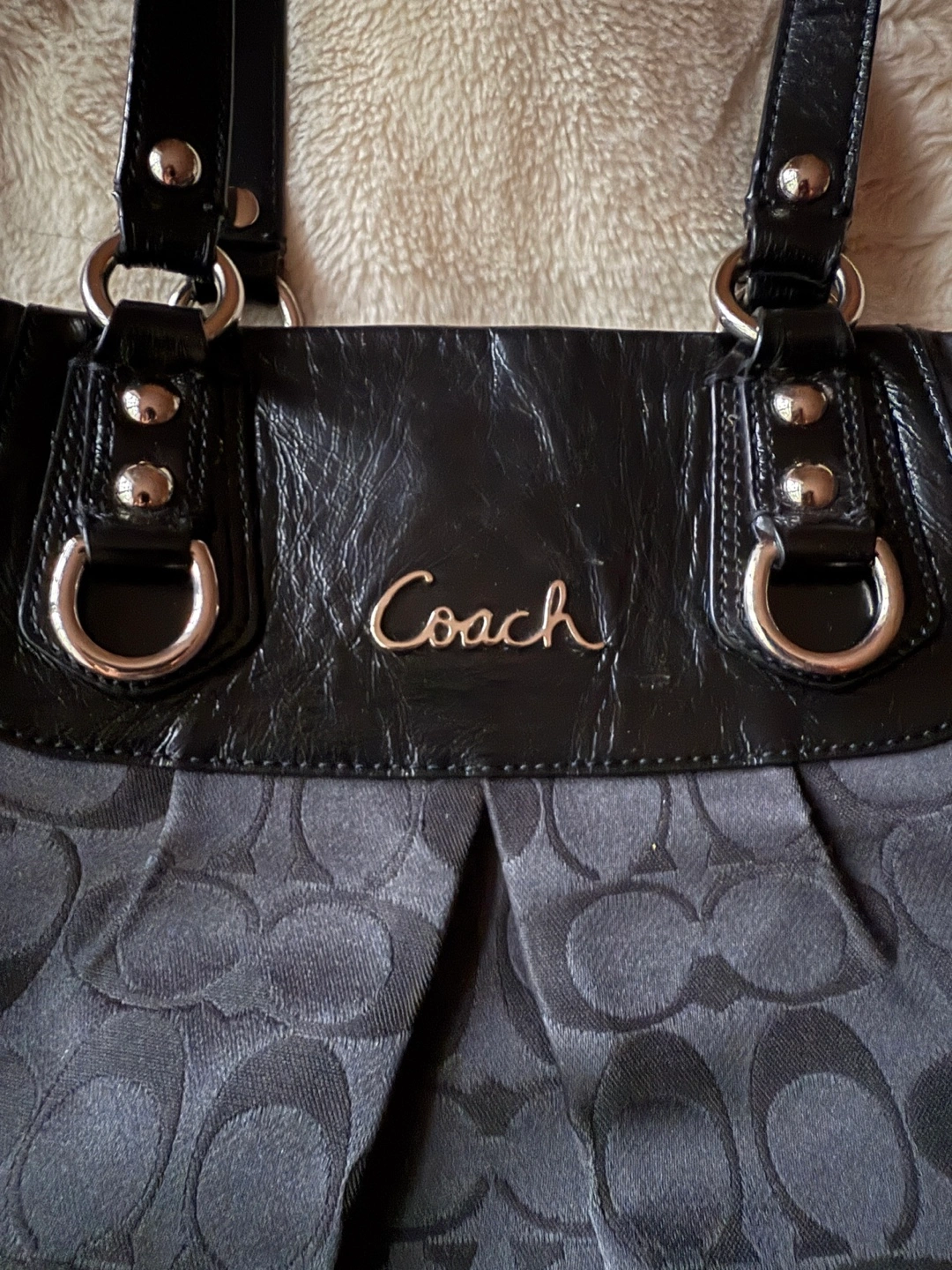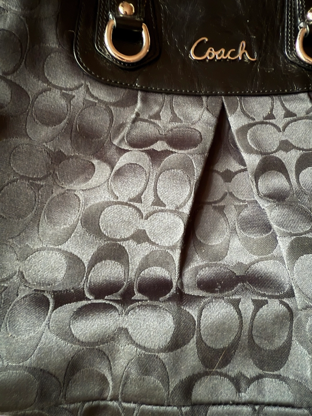 Black Coach handbag with silver accents. Features handles and silver rings. Inside with a zippered pocket and a few compartments. A perfect everyday item for your busy lifestyle.