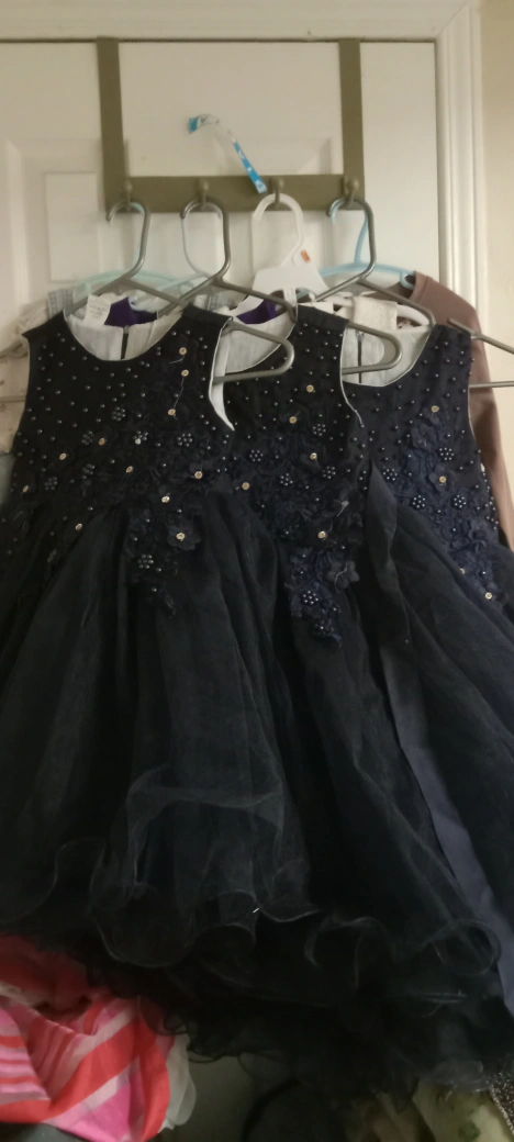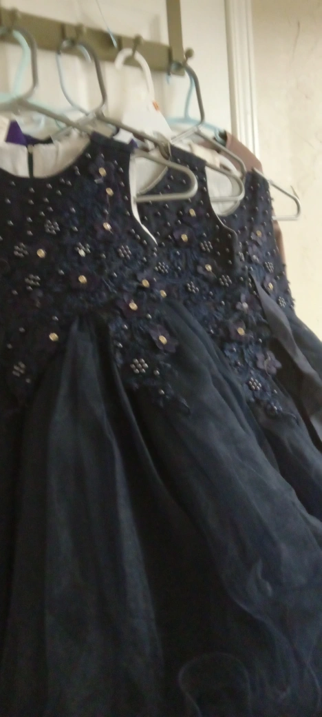 These beautiful dresses hang on clothing hangers. The bodice features detailed beading and lace appliques. The skirt has layers of tulle. They would make a lovely addition to a wardrobe.