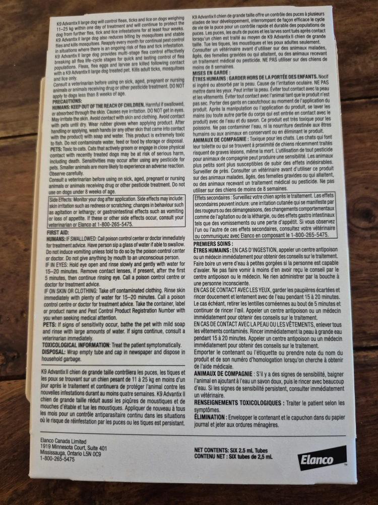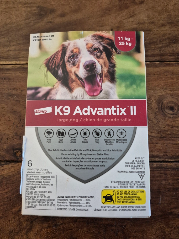 Six months of treatment for dogs weighing 11 kg to 25 kg. Effective against fleas, ticks, mosquitoes, lice, and more! Retails $153.97 plus tax on Amazon. New in box.
