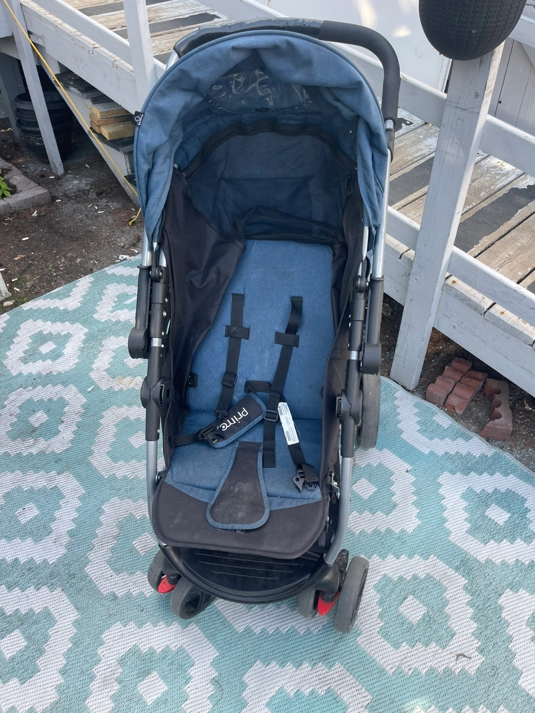 The stroller features a blue fabric canopy and seat. It has a black frame, and four wheels. A safe and reliable way to move your baby.