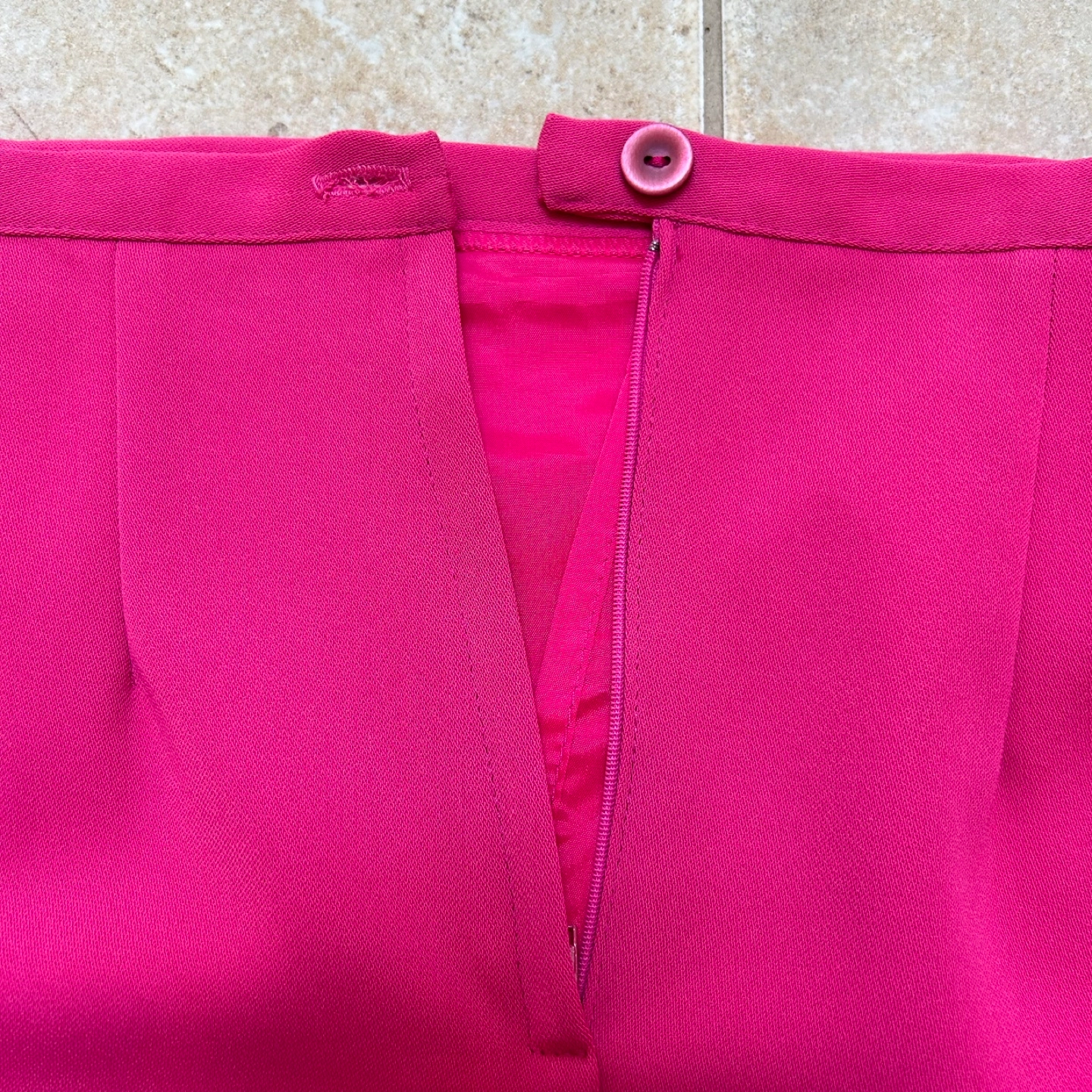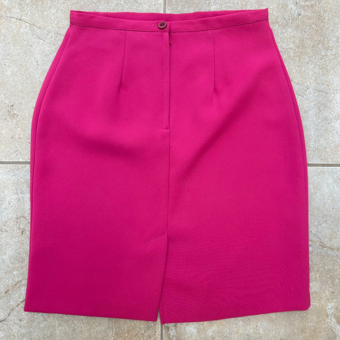 This striking double-lined pink pencil skirt is designed for cocktail events and nights out, featuring a knee-length cut and a stylish slit for added flair. Its structured silhouette and high waistline create a flattering fit, making it a standout piece in any wardrobe.