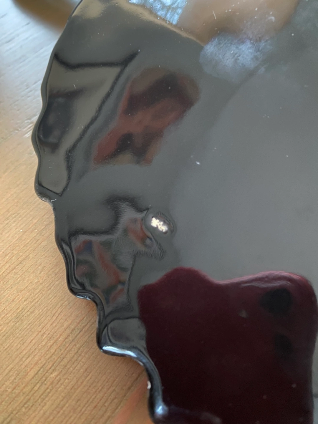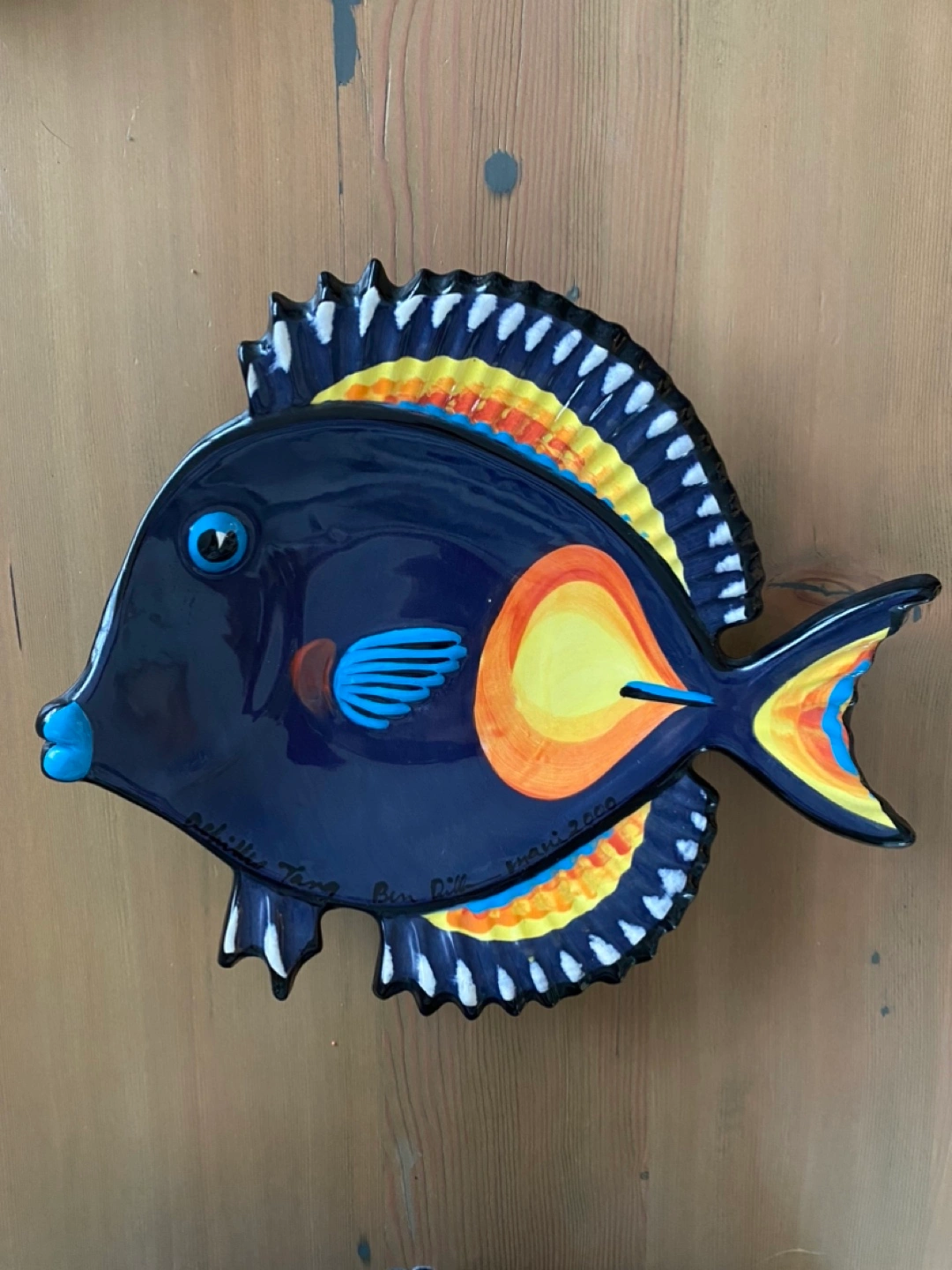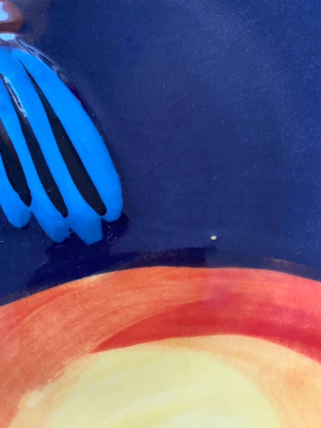 Handmade in Maui, HI (2000). Bright tropical colours with two small flaws, called a pinhole and crawling, in the glaze. Hanger on the back. Substantial weight.