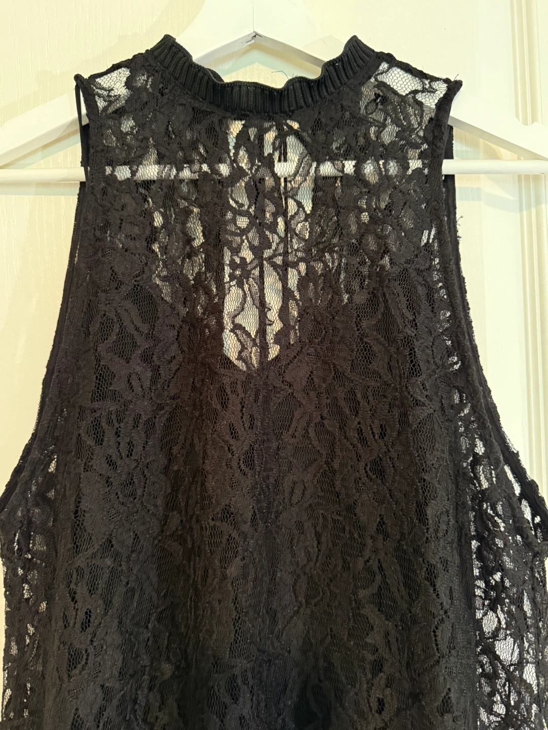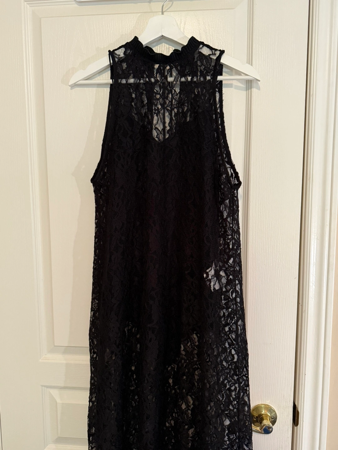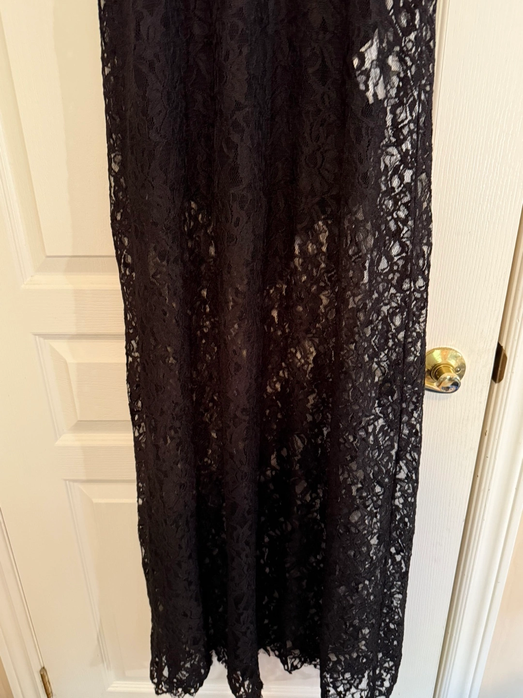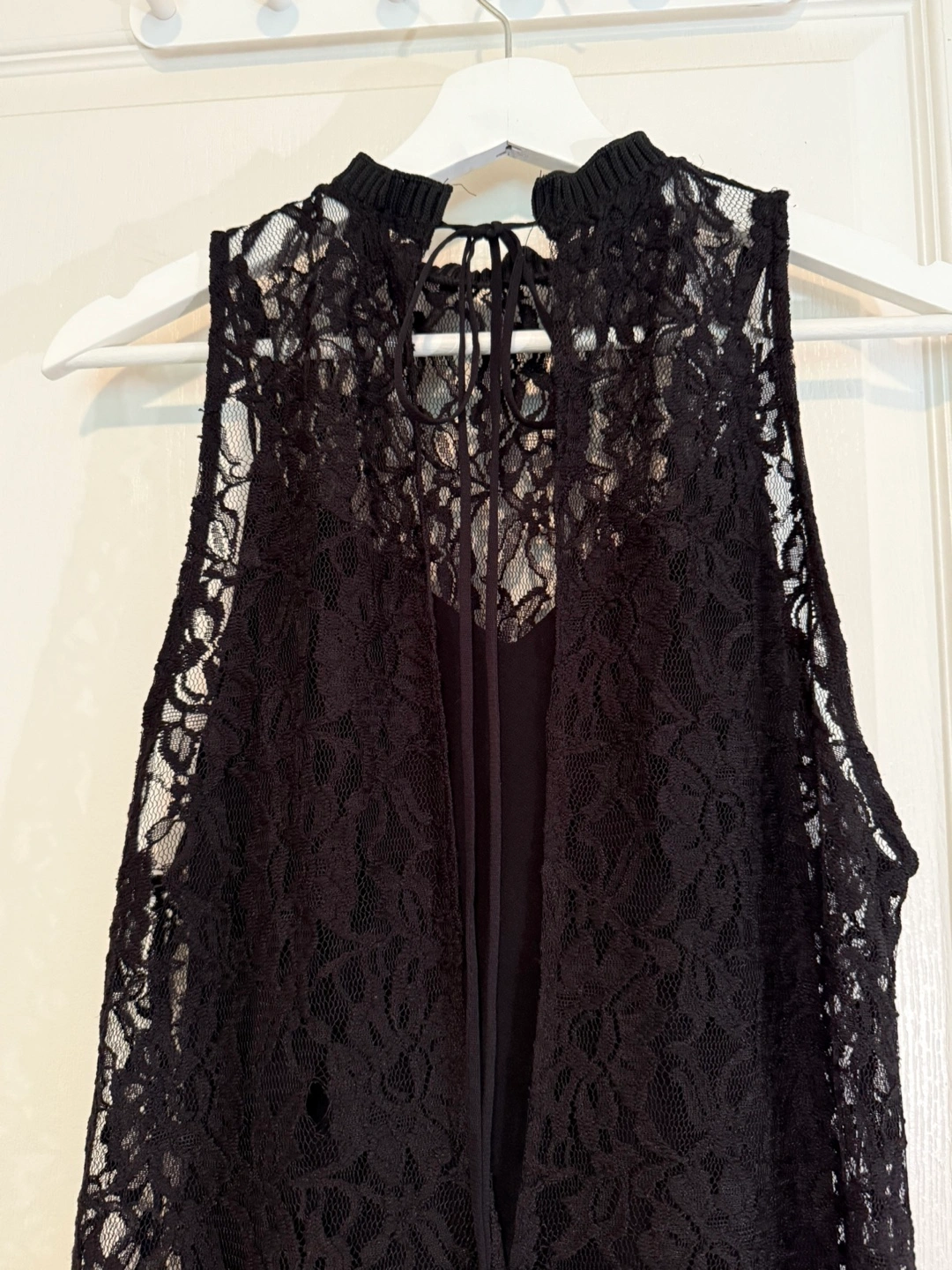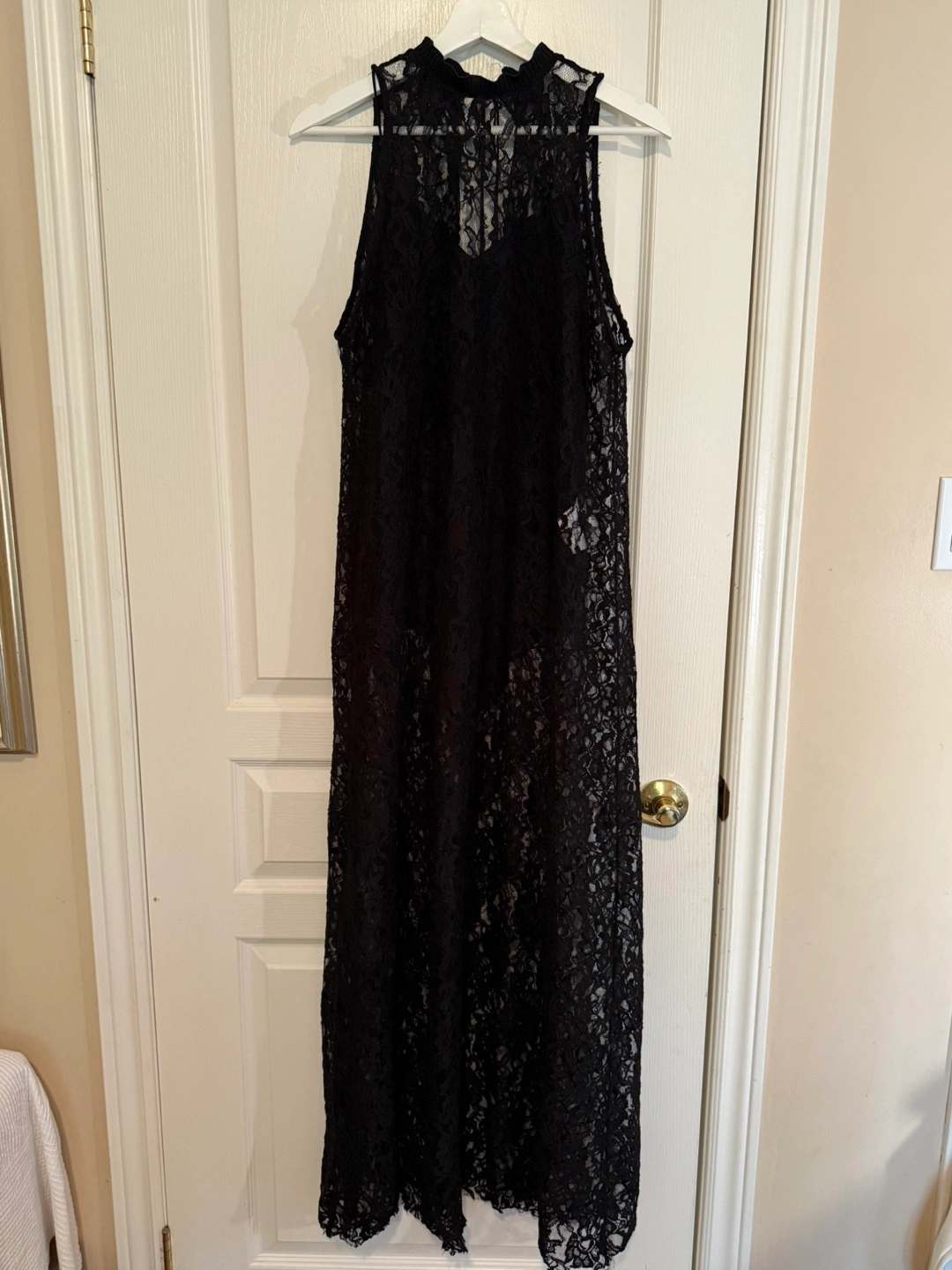 A stunning black lace maxi dress. Sleeveless design. Features a mock neck with a tie. Perfect for a special event or a lovely evening out.