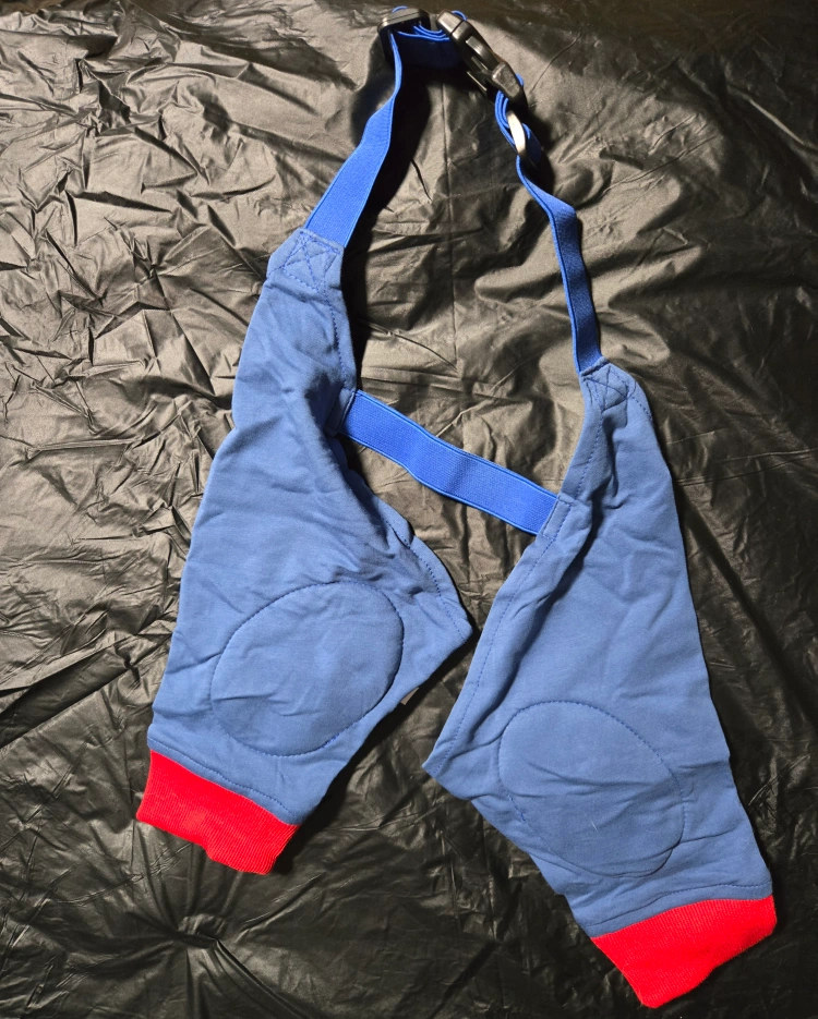 Leg braces for dogs, designed for protecting joints and taking care of wounds. The braces have a blue and red colour scheme. Comfortable fabrics and breathable cotton pads are included.