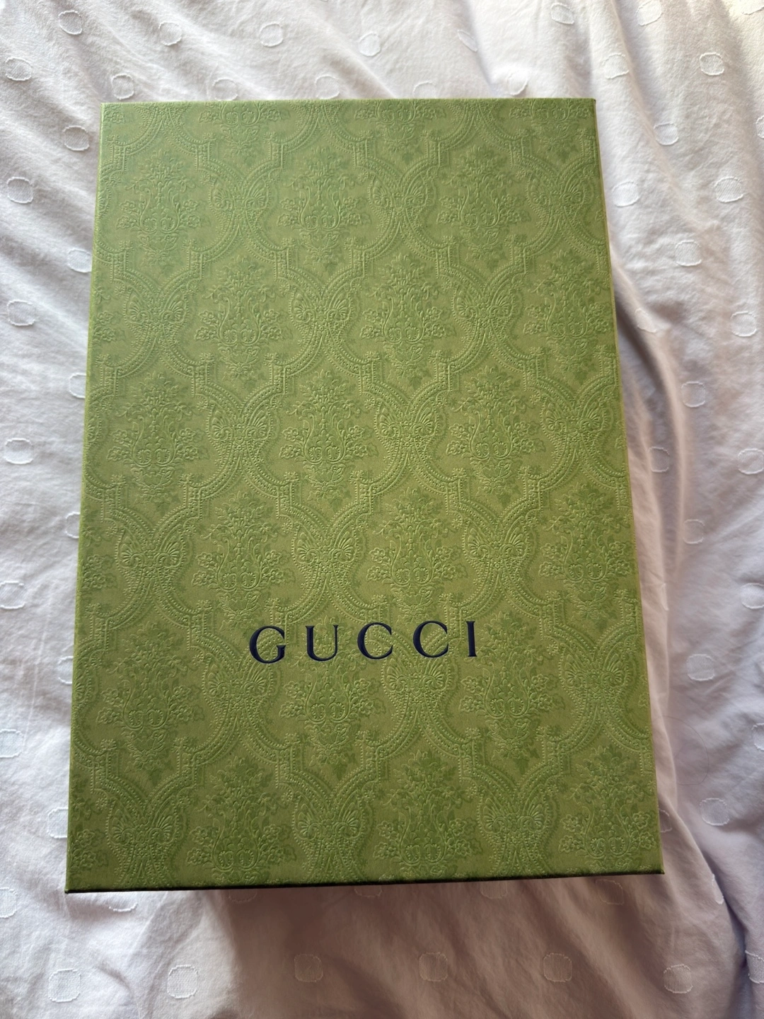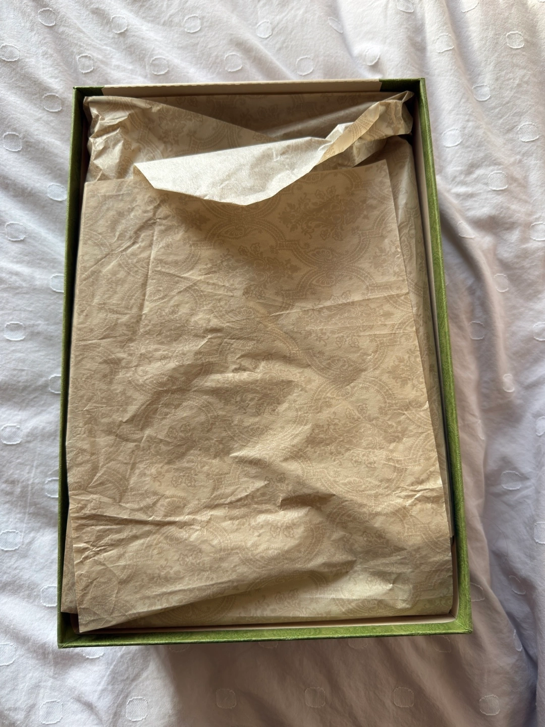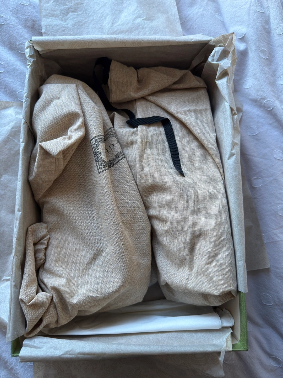 Nice sneakers resting on top of their box. Features the brand logo in gold. Comes with a second set of laces. You may want to take these shoes on a relaxing stroll.