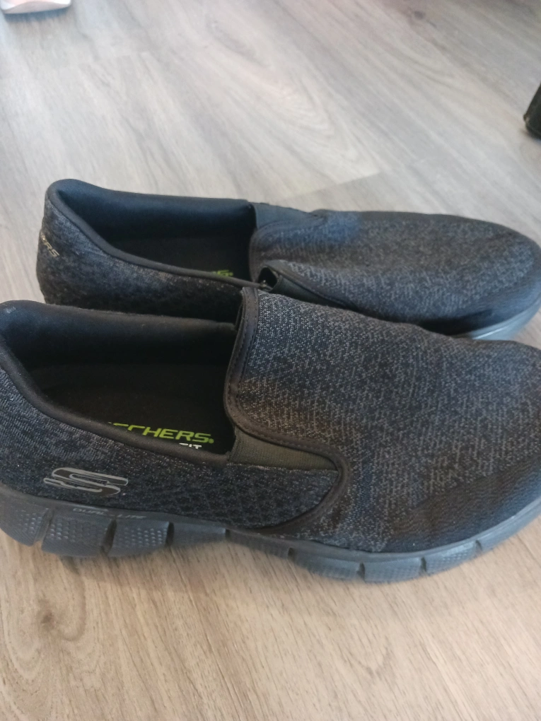 A pair of slip-on sneakers. They appear to be a dark colour. The soles have a textured design. A great pair of shoes for a relaxing walk.