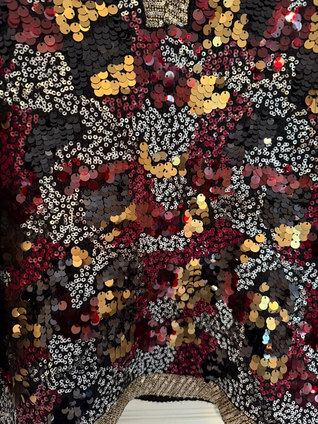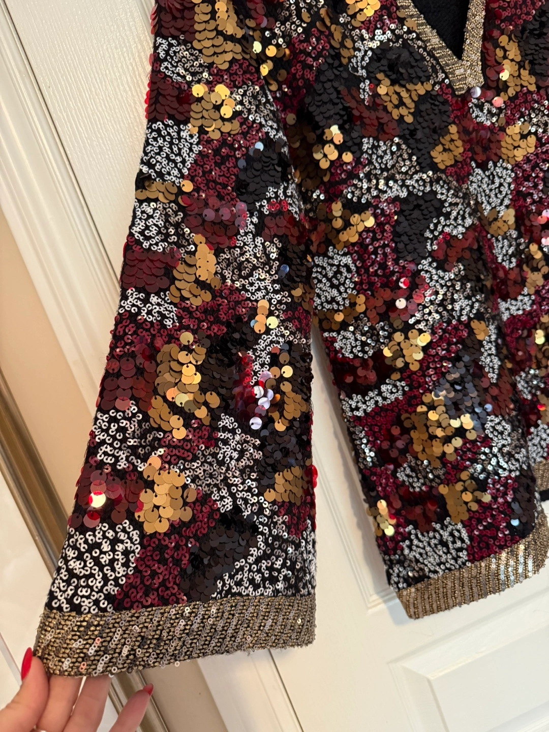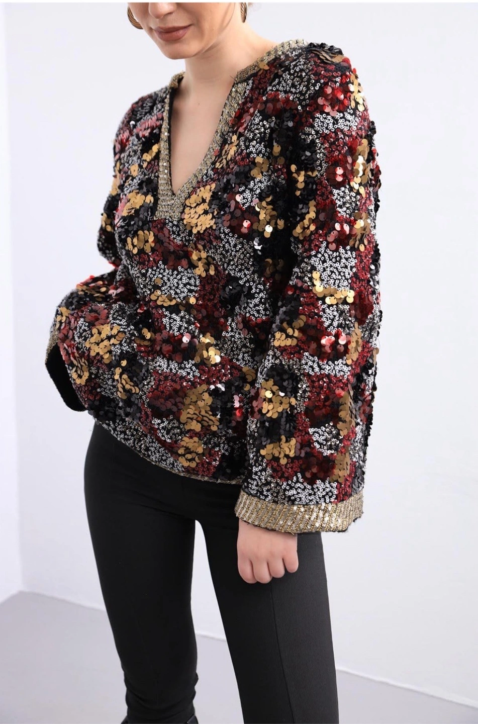 The sweater is embellished with a variety of sequins. Features a V-neckline with beaded trim. You will feel confident wearing this sweater.