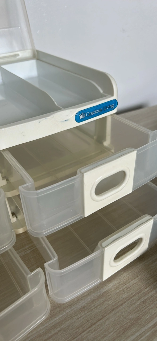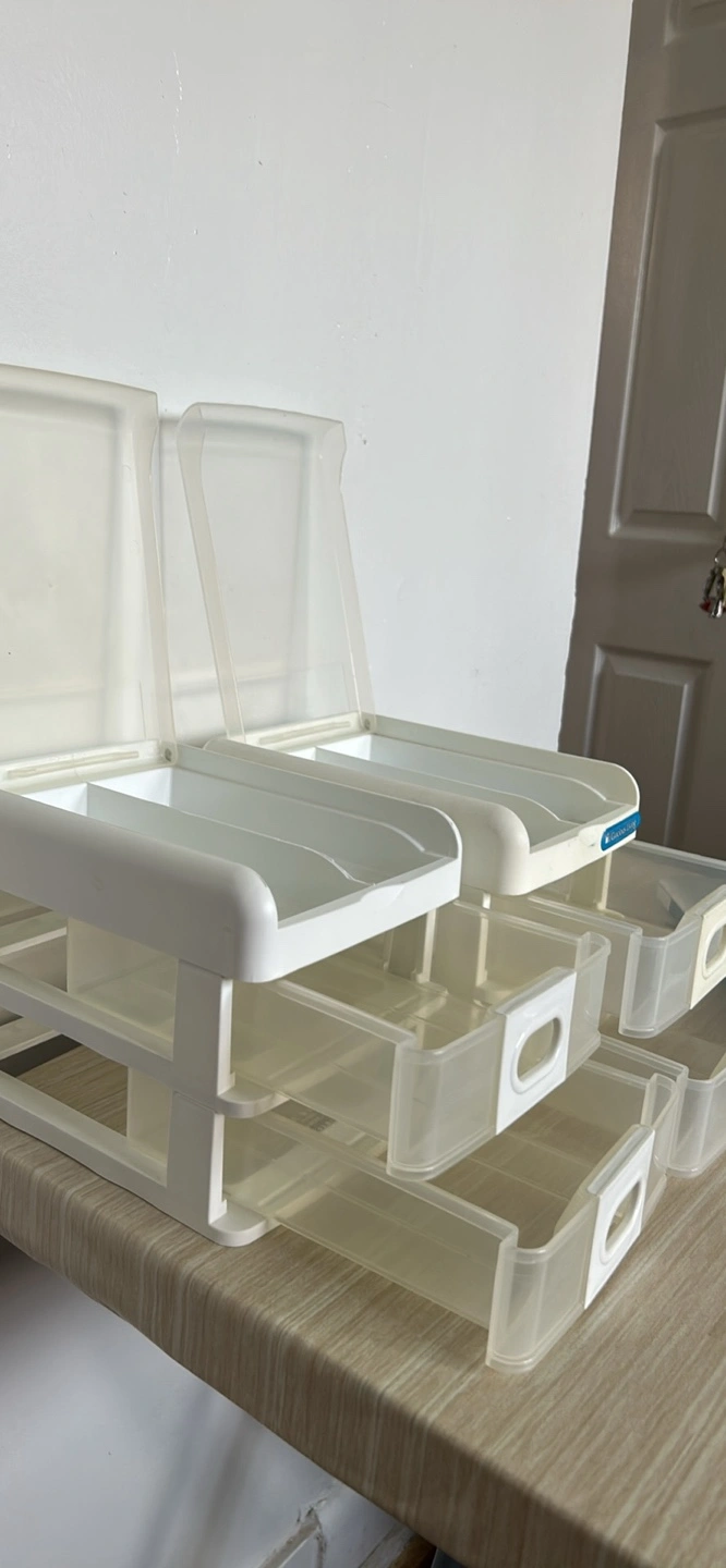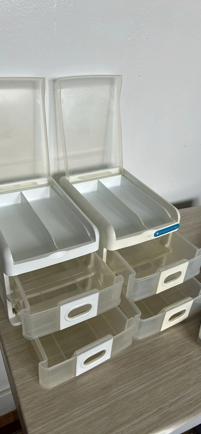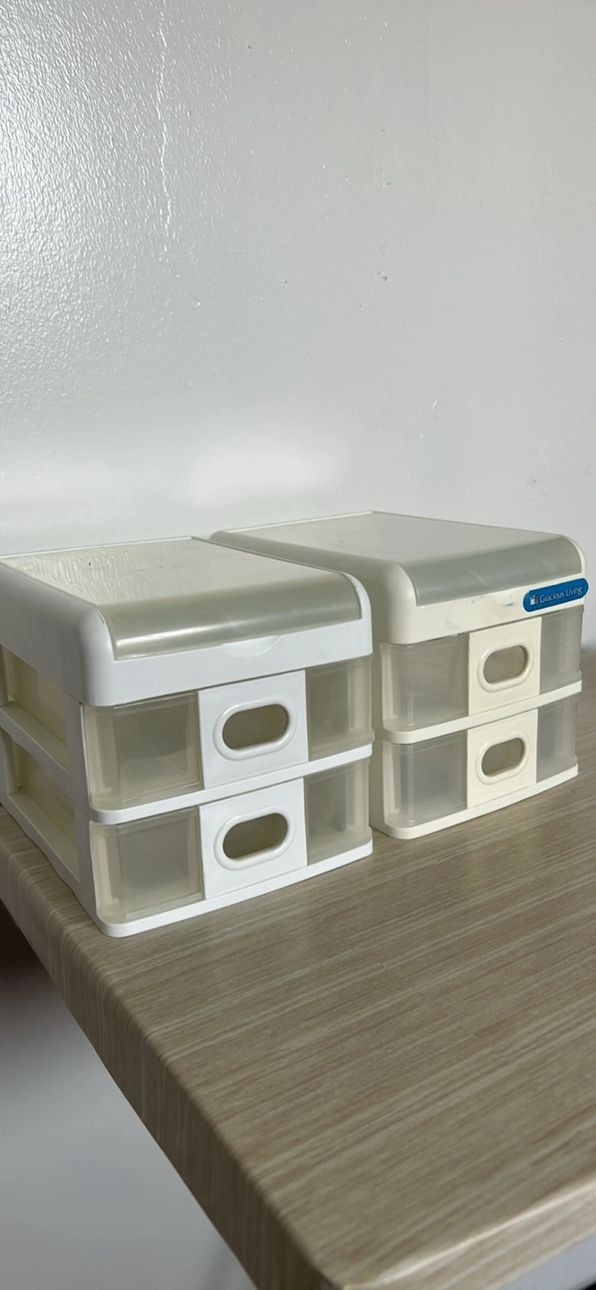 These two-tiered drawers are perfect for storing small items. They are white with clear drawers. The drawers can slide out with ease. Place these in a quiet space and organize your treasures for a calming effect.