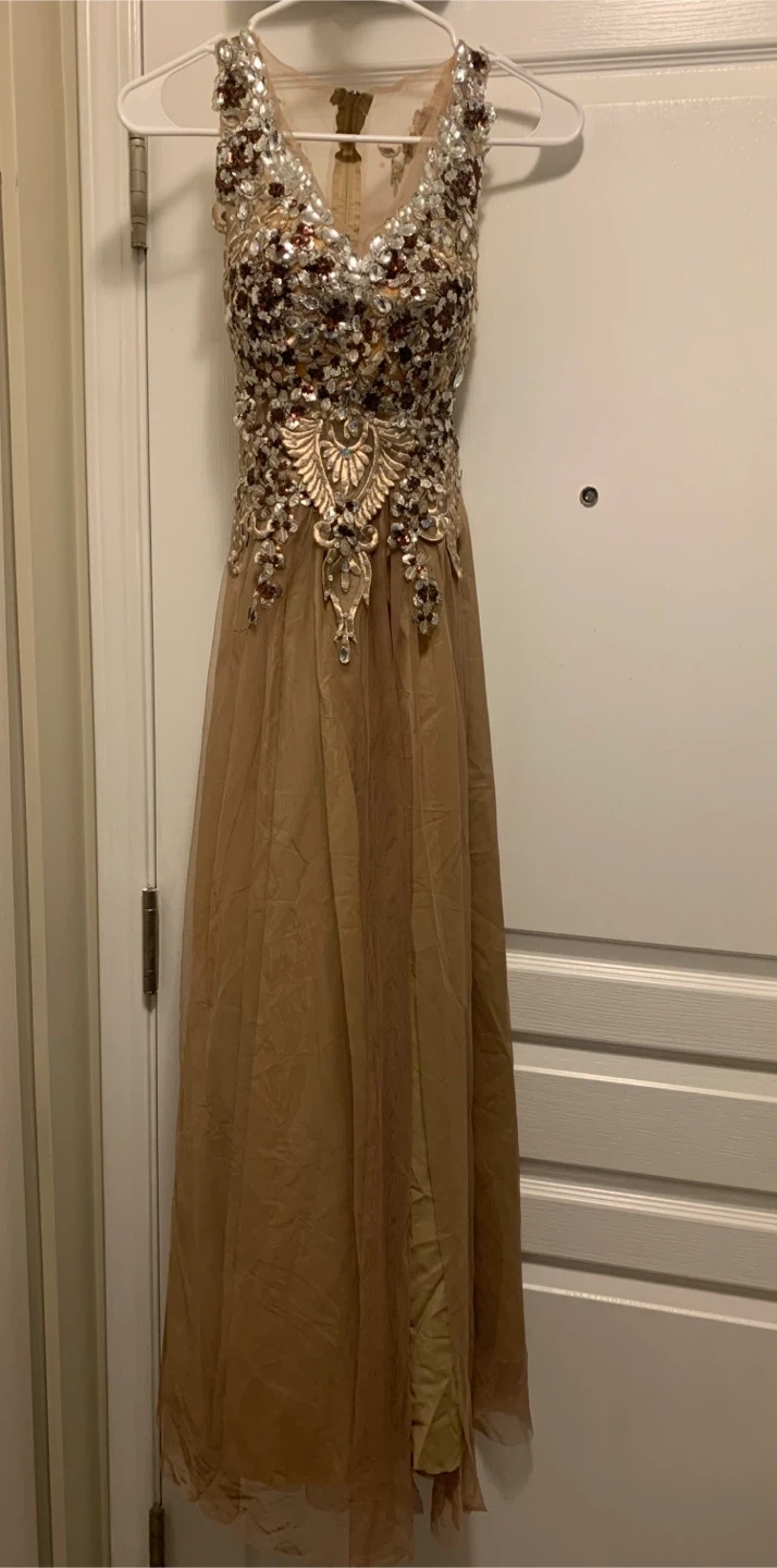 This is a stunning embellished evening gown in a champagne or gold colour. It features a richly decorated bodice with rhinestones and beadwork. The skirt is made of flowing fabric. Perfect for formal events or parties!