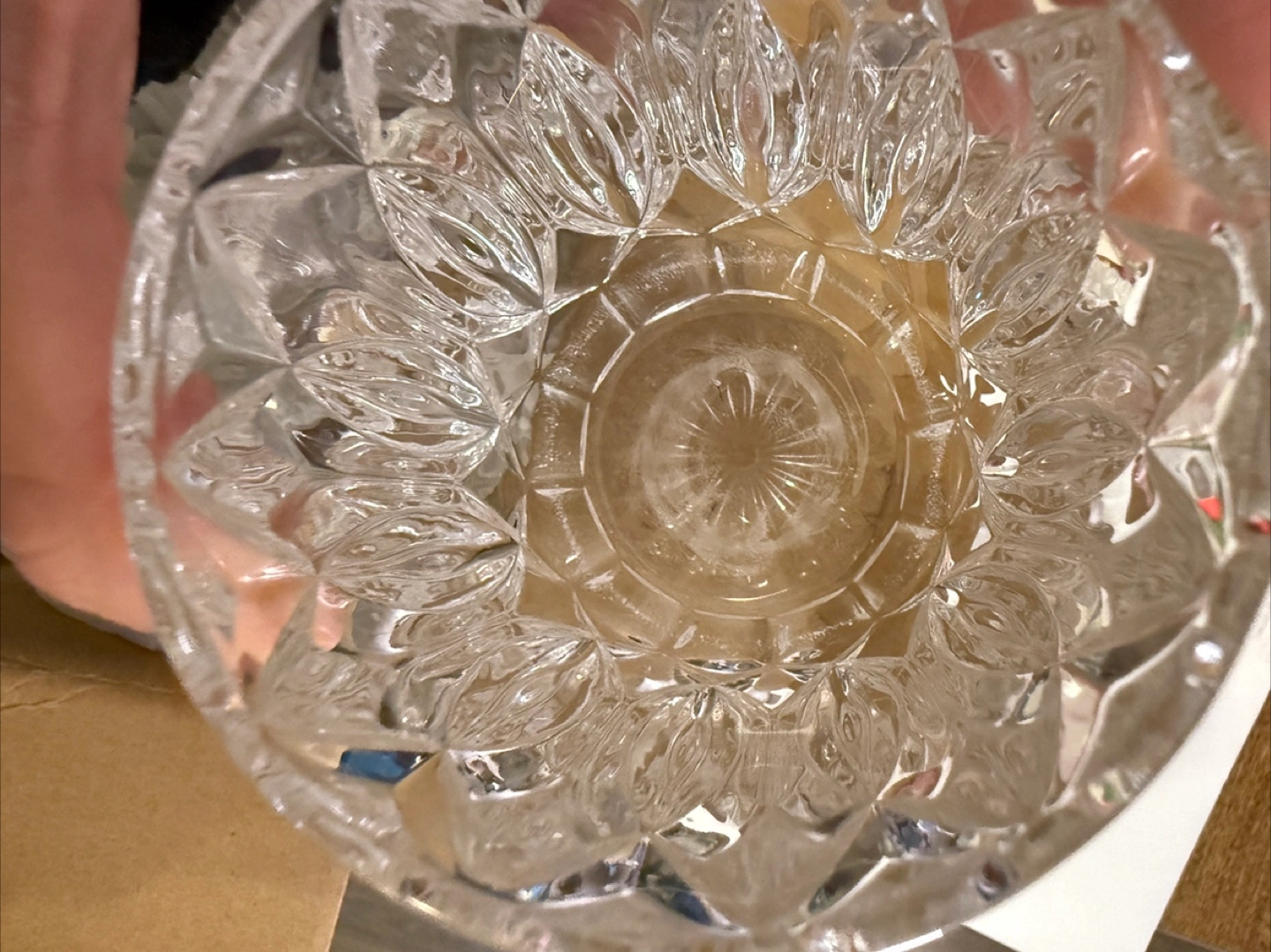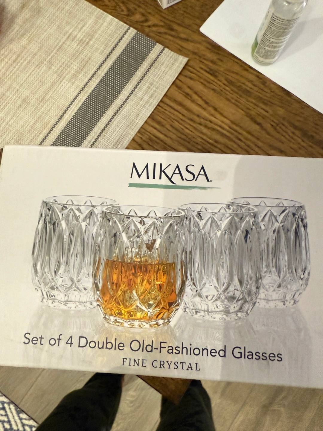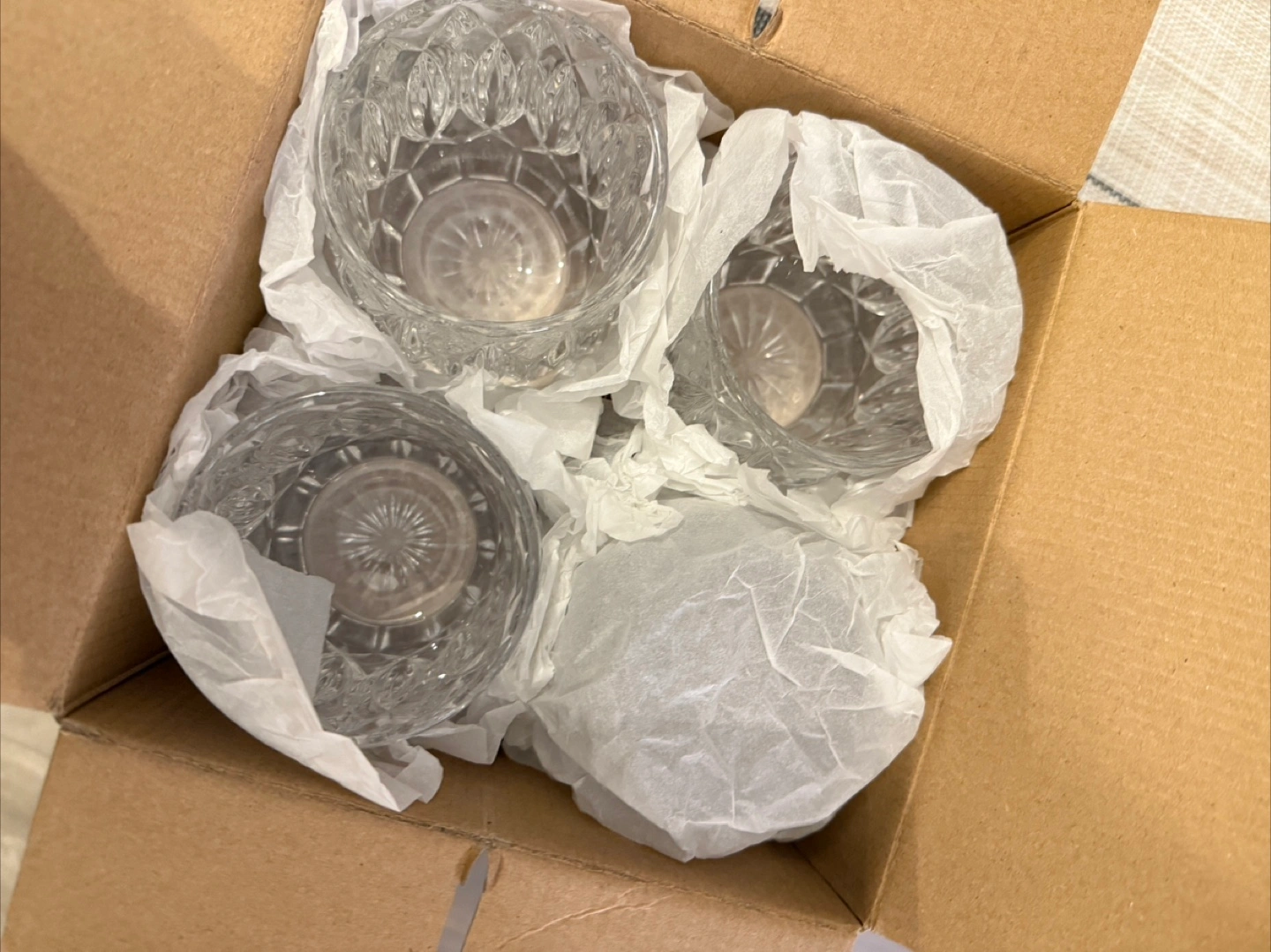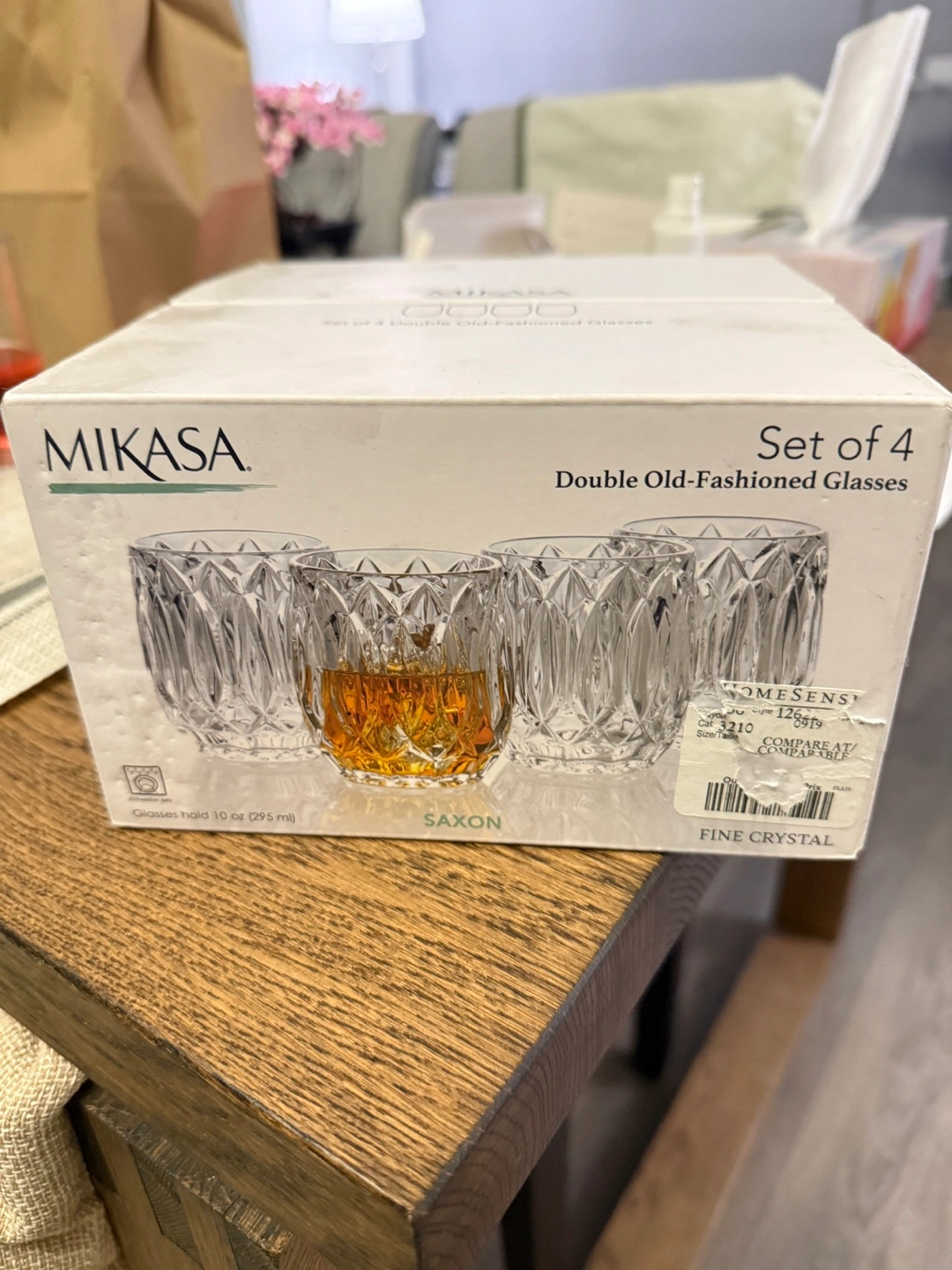 Here I have a set of four glasses. Each glass is made of fine crystal. They are packaged in a original box.