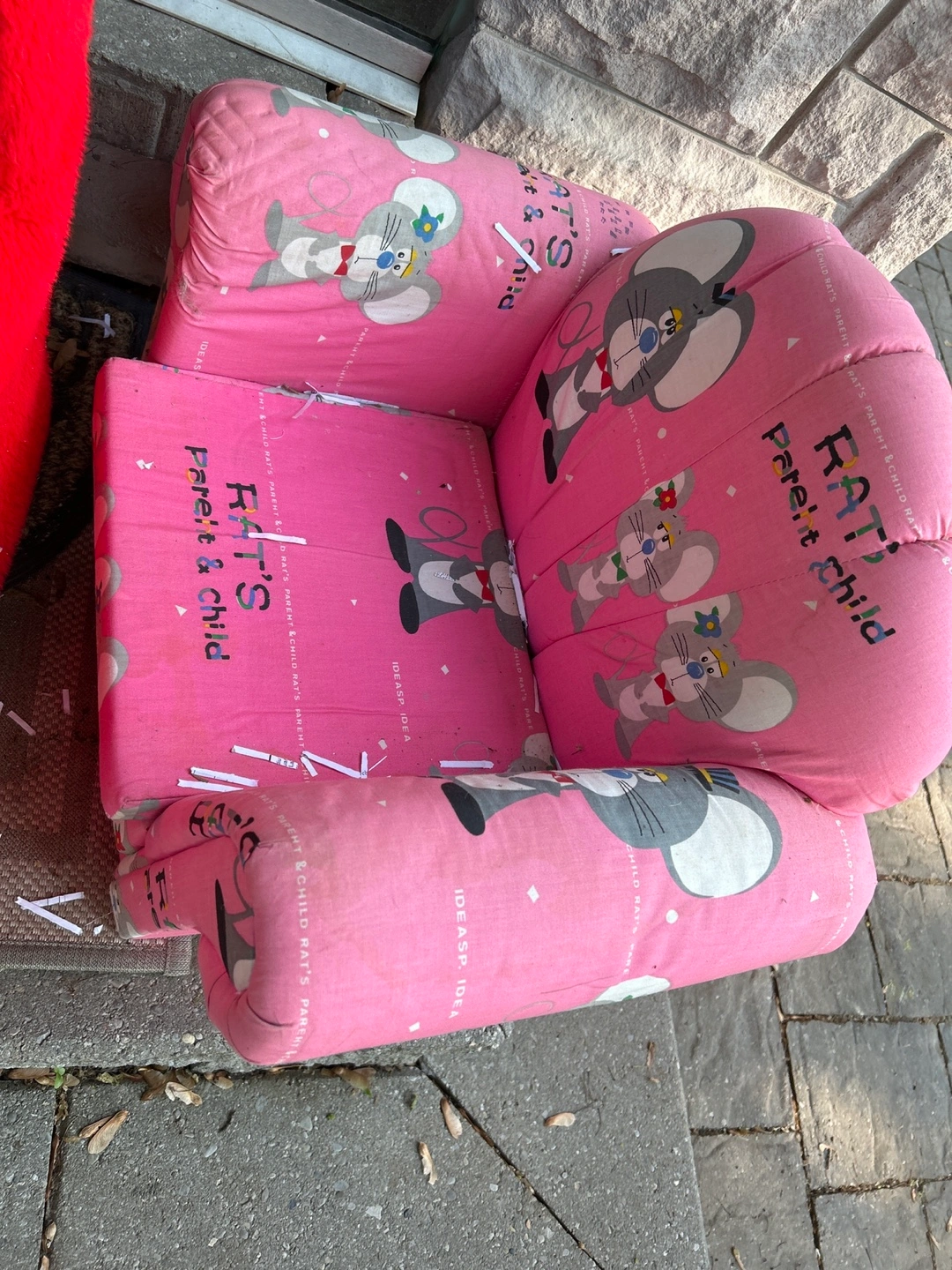 A cozy, red children's chair. Featuring Elmo on the backrest. A pink chair beside it with a cartoon mouse print, it is perfect for your kids to chill and read a book in peace.