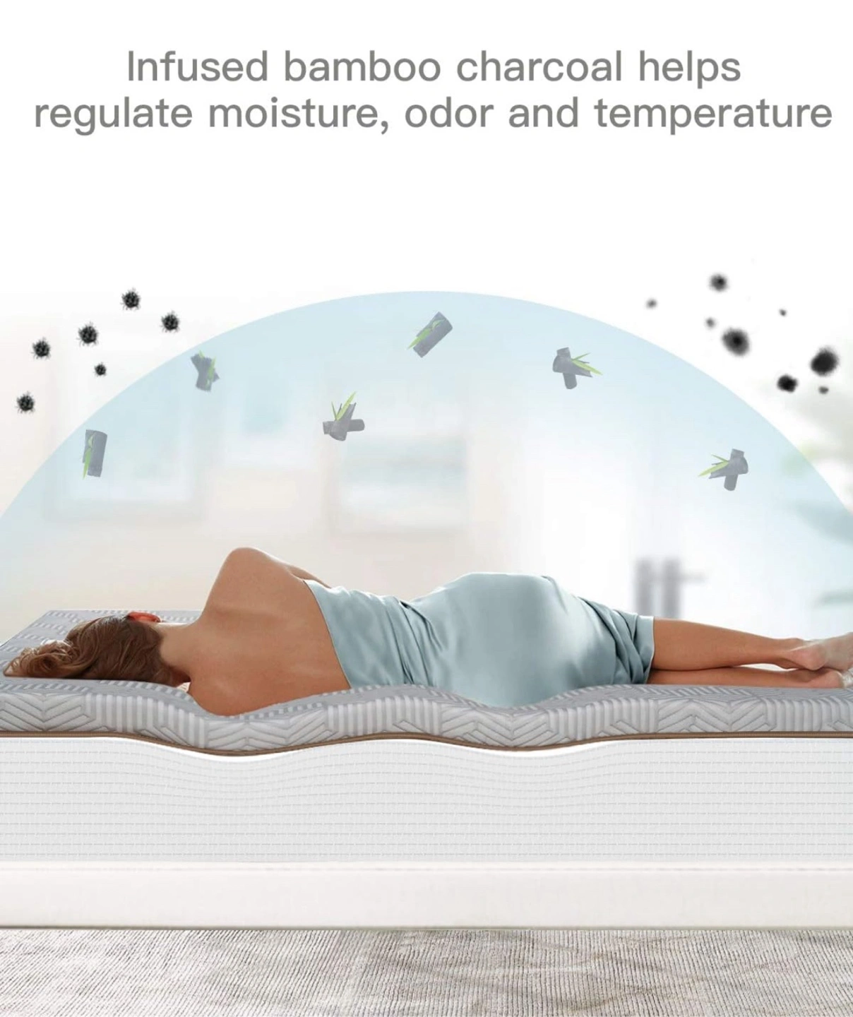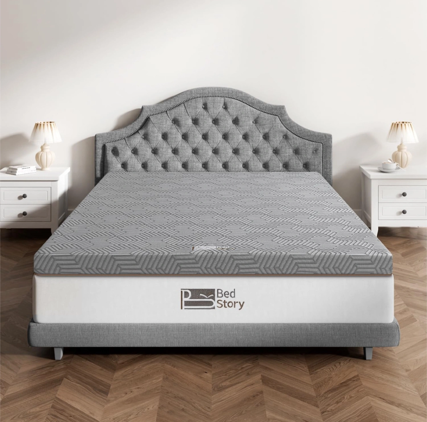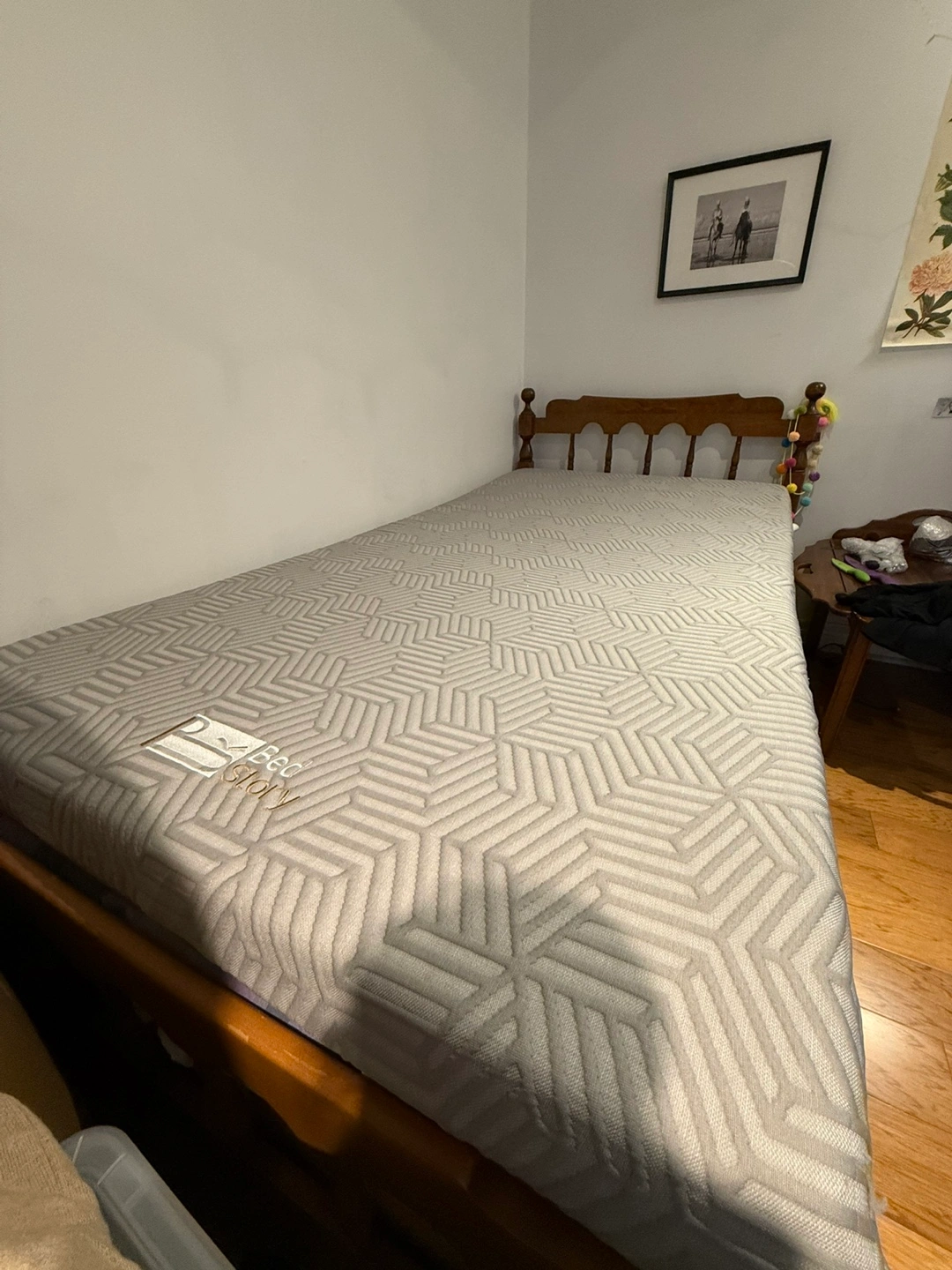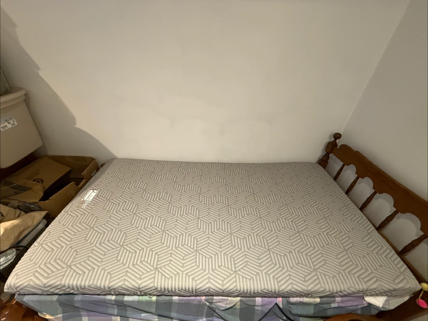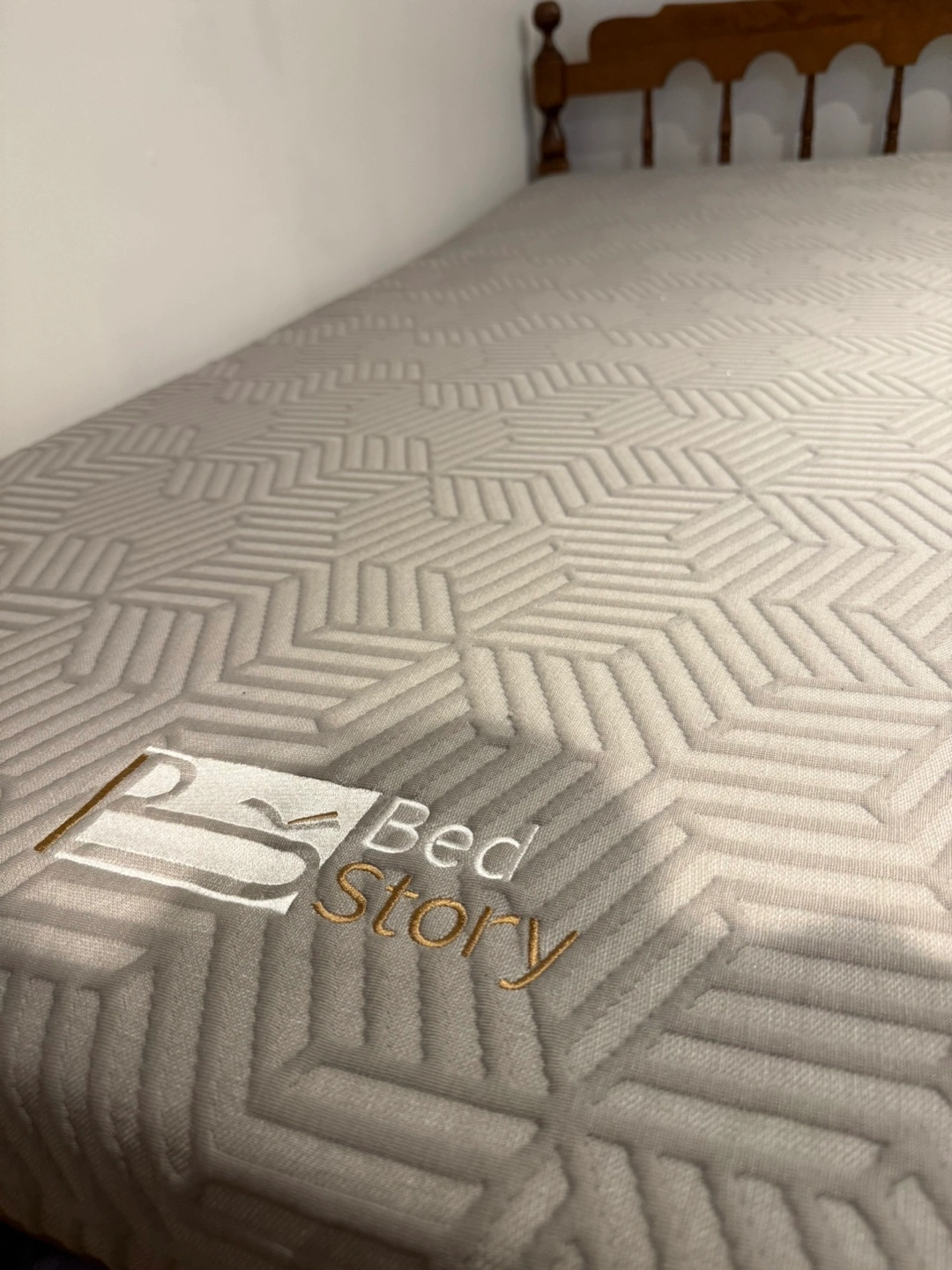 The mattress is light grey with a geometric pattern. It rests on a wooden bed frame. Get ready to relax on this comfortable mattress after a long day.