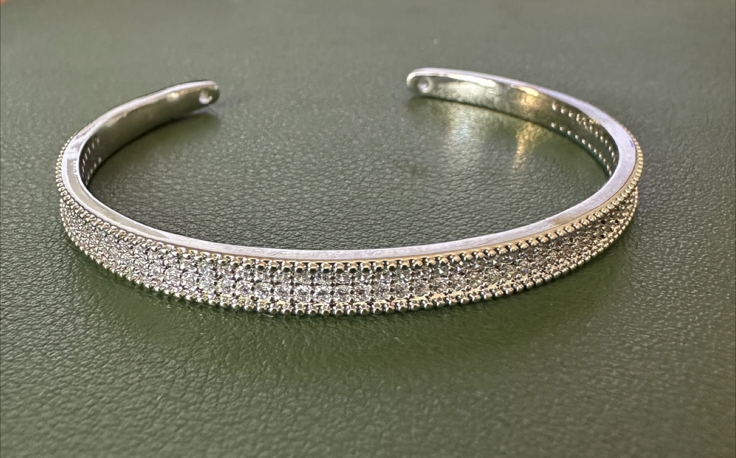 292This cuff bracelet, featuring pave set stones, would be a wonderful addition to any outfit. The bracelet features a smooth metal design that curves to fit the wrist, with open ends.