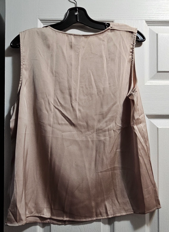 A beautiful champagne colour sleeveless top. Features a V-neck. You can wear this for a nice night out, dress it up or down.