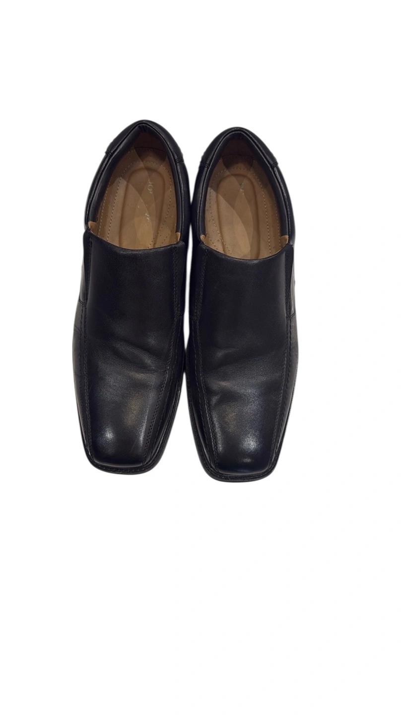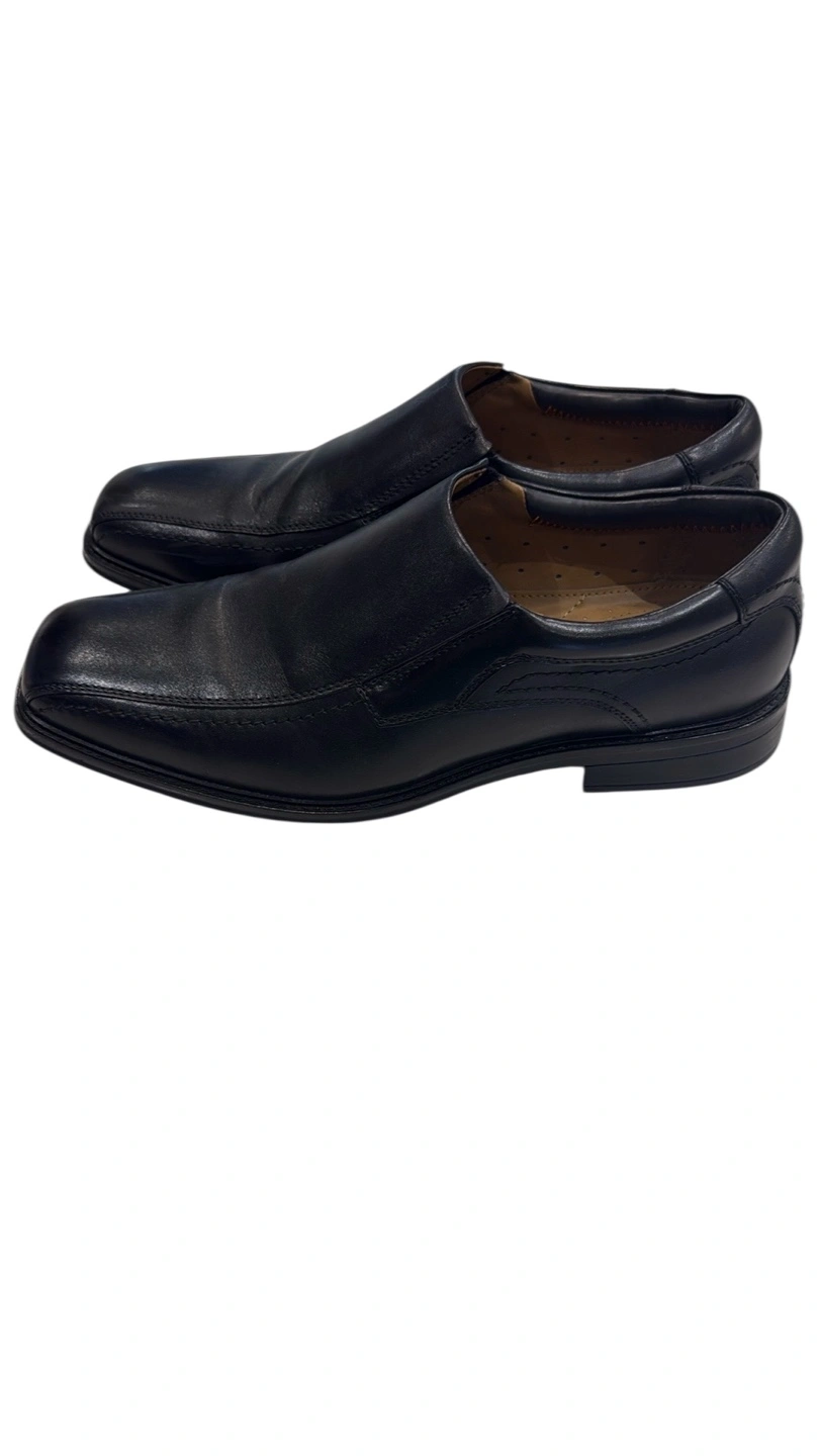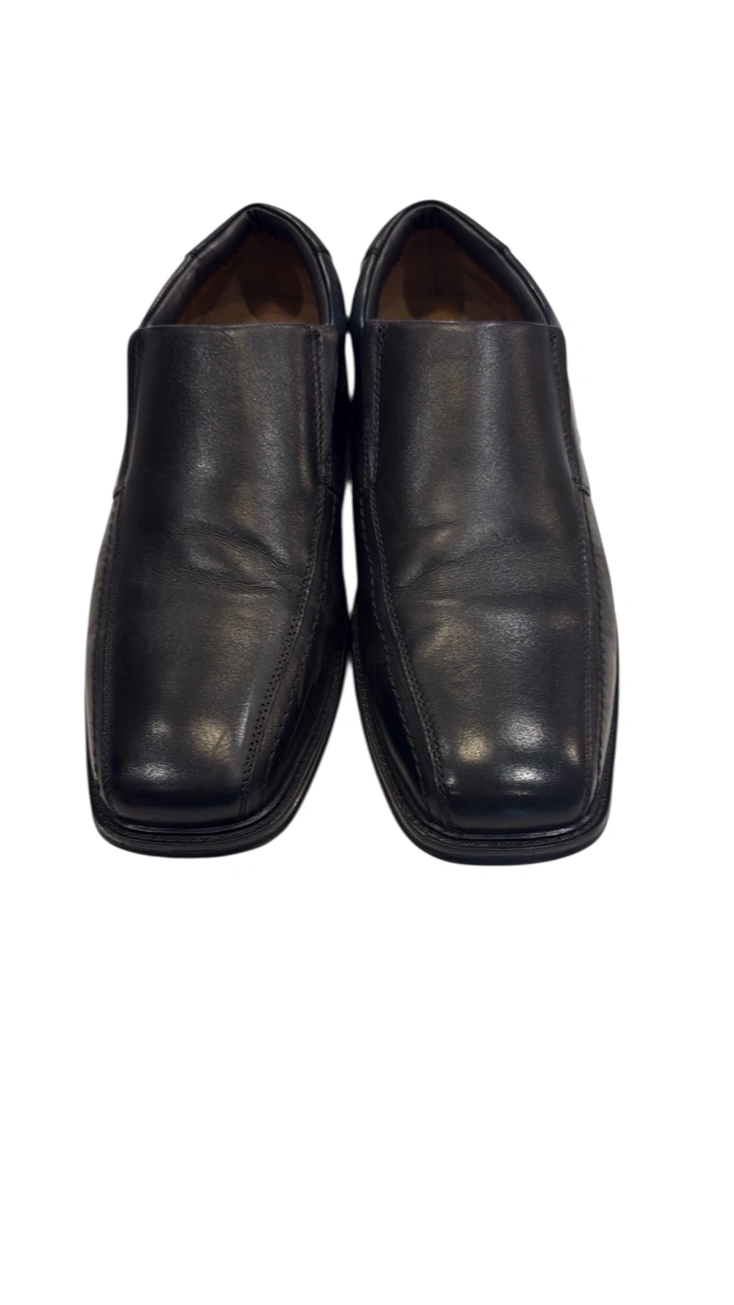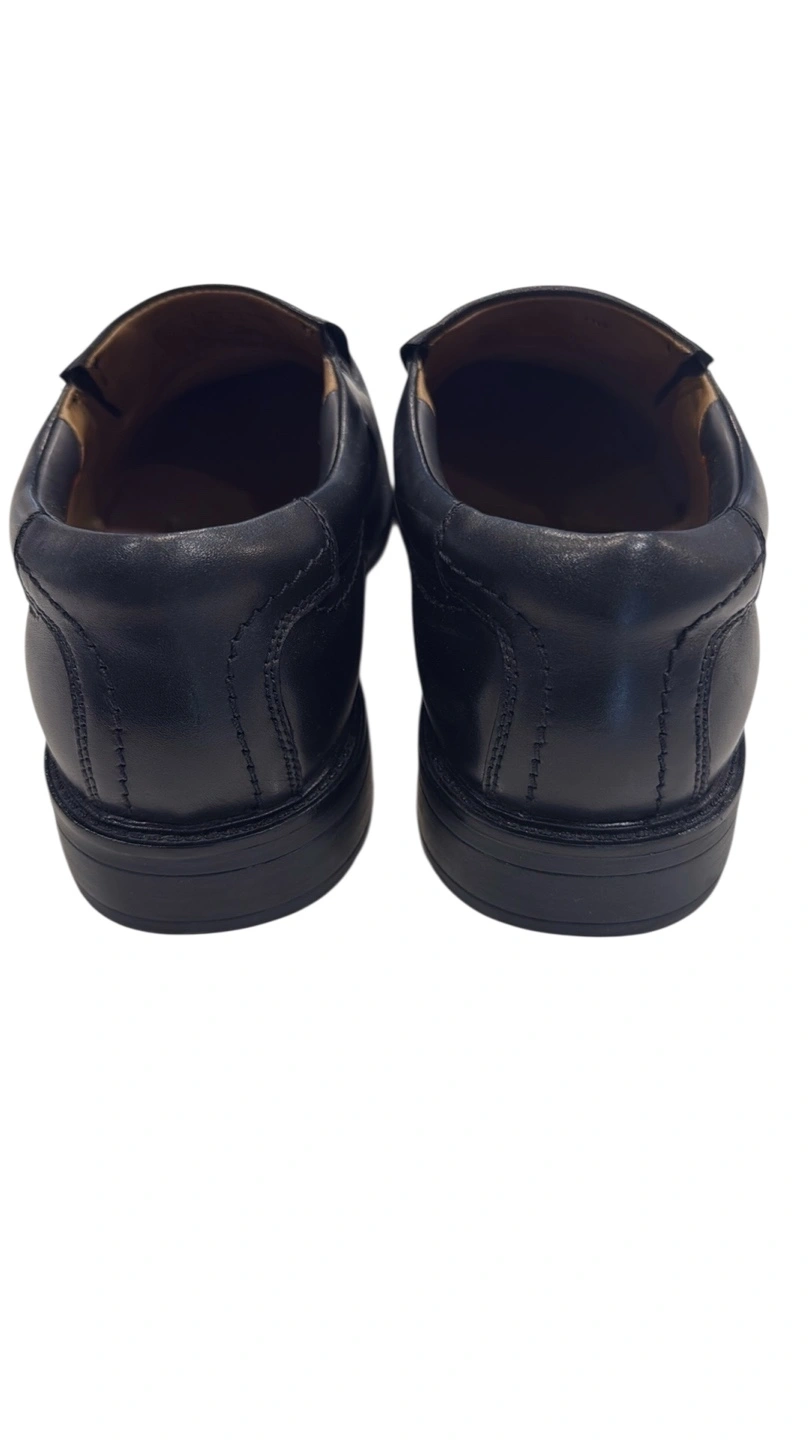 A pair of black dress shoes. Feature a slip-on style. Show some stitching details. The shoes are likely made of leather. Dress shoes can add a touch of sophistication to your look, helping you feel your best.