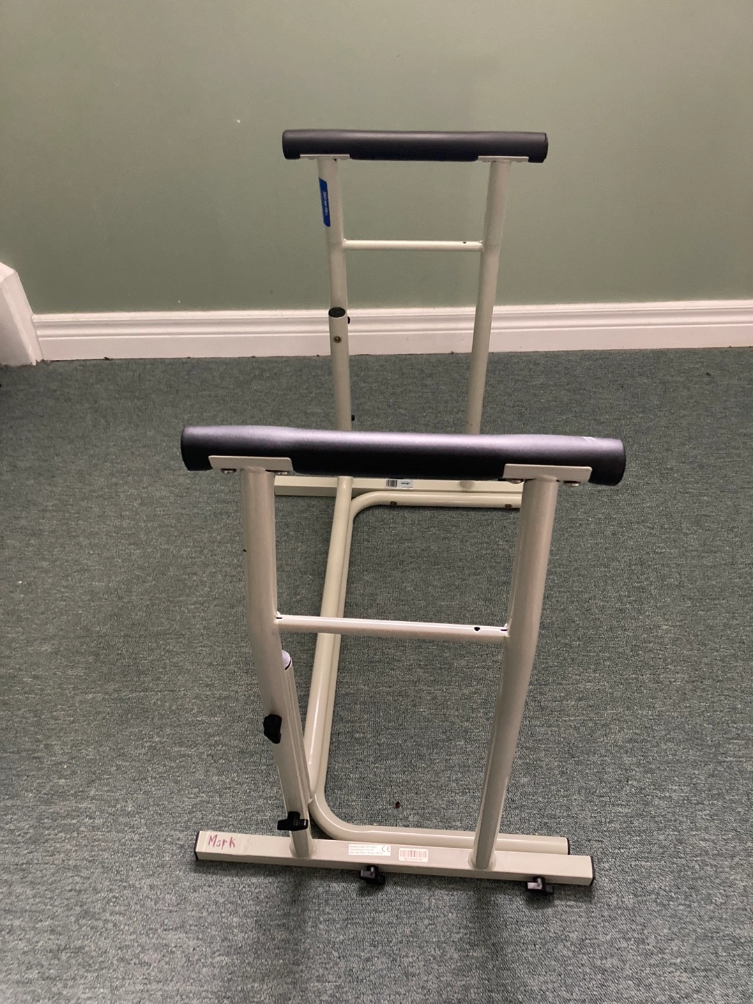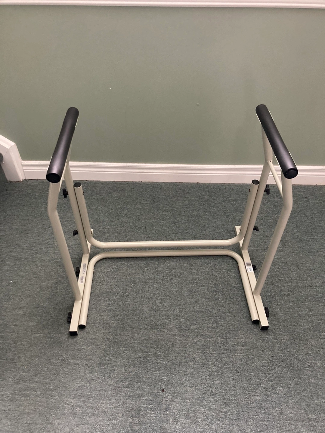 Metal frame with two handles. There are adjustment knobs. Stand aid for toilet. Excellent condition.