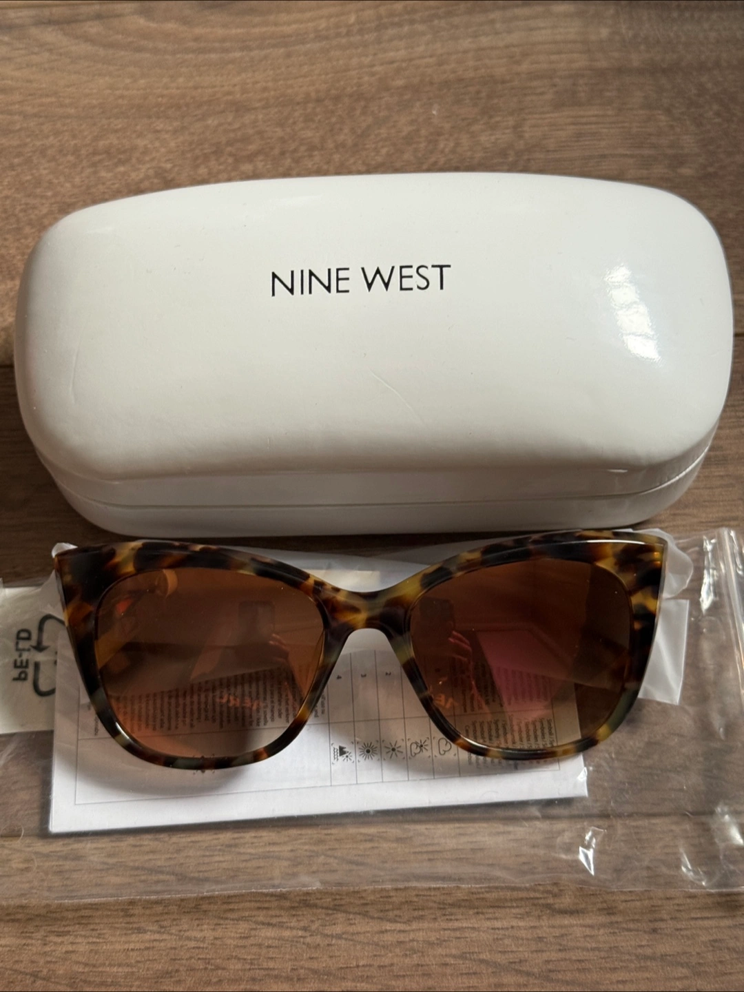 The sunglasses come with a case. Tortoiseshell frames. The lenses are a gradient tint. Perfect for shielding your eyes from the sun during a nice stroll.