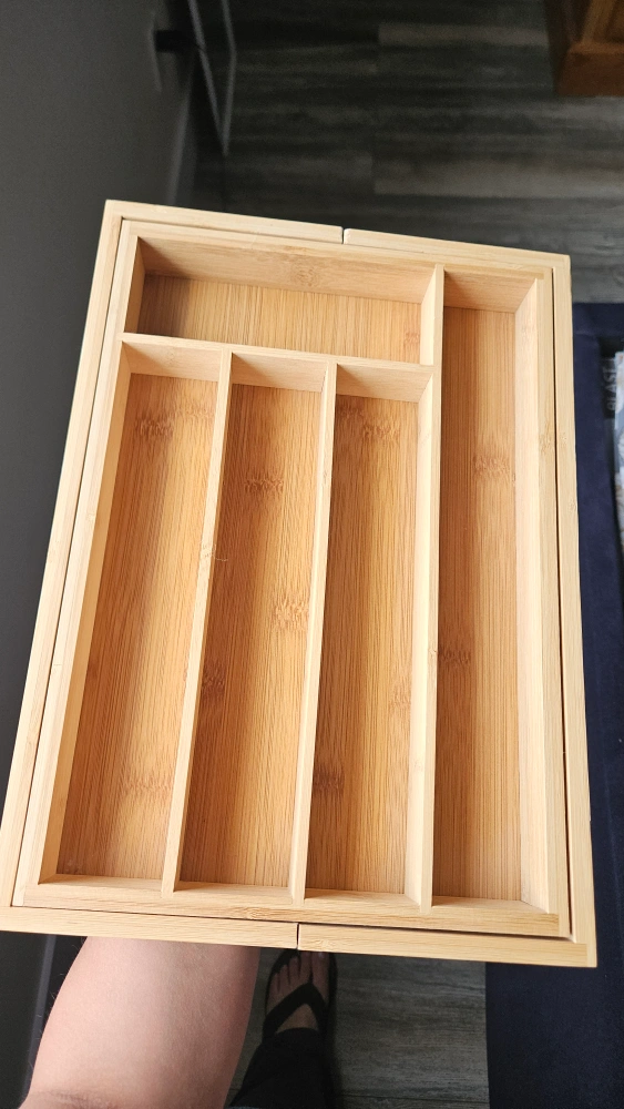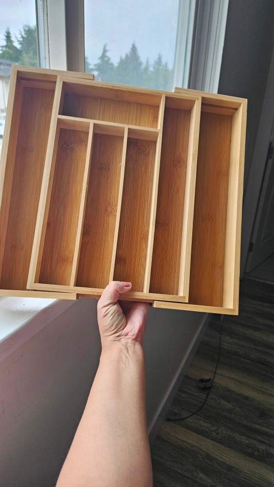 A bamboo drawer organizer. Features multiple compartments, made of bamboo. The organizer can expand to fit various drawer sizes. It is wonderful for anyone who loves to stay organized in their kitchen or office.