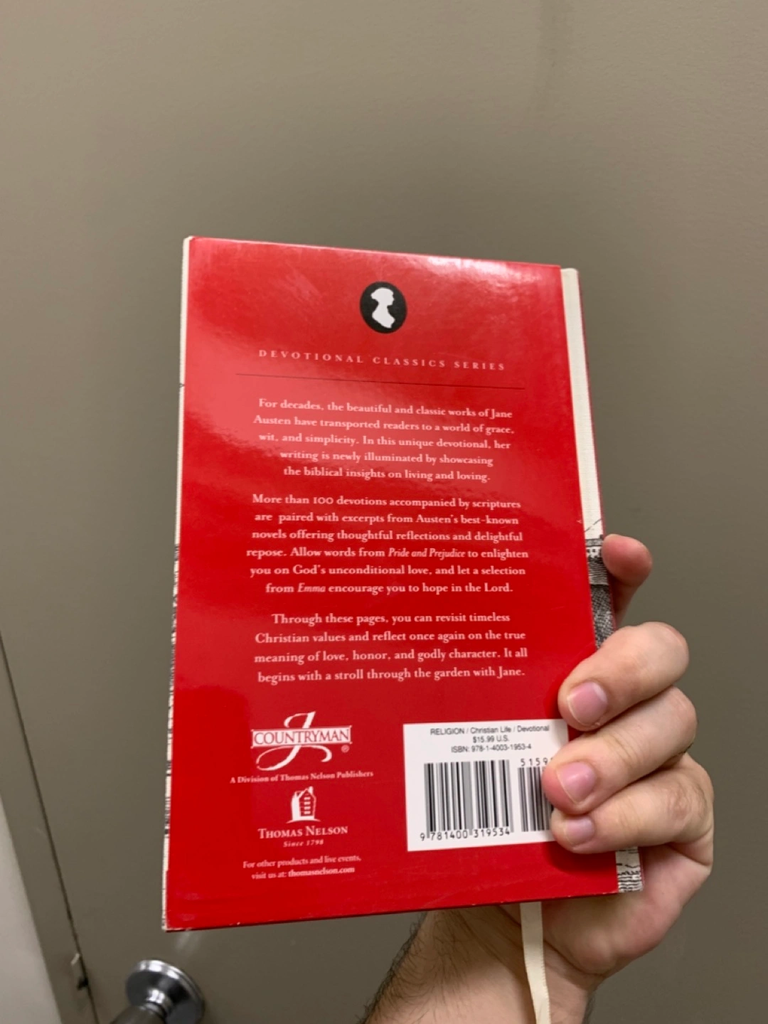 144A devotional book. Features a red and white cover. Includes a bookmark. The back of the book provides details about the book's contents. A lovely read before bed for relaxation.