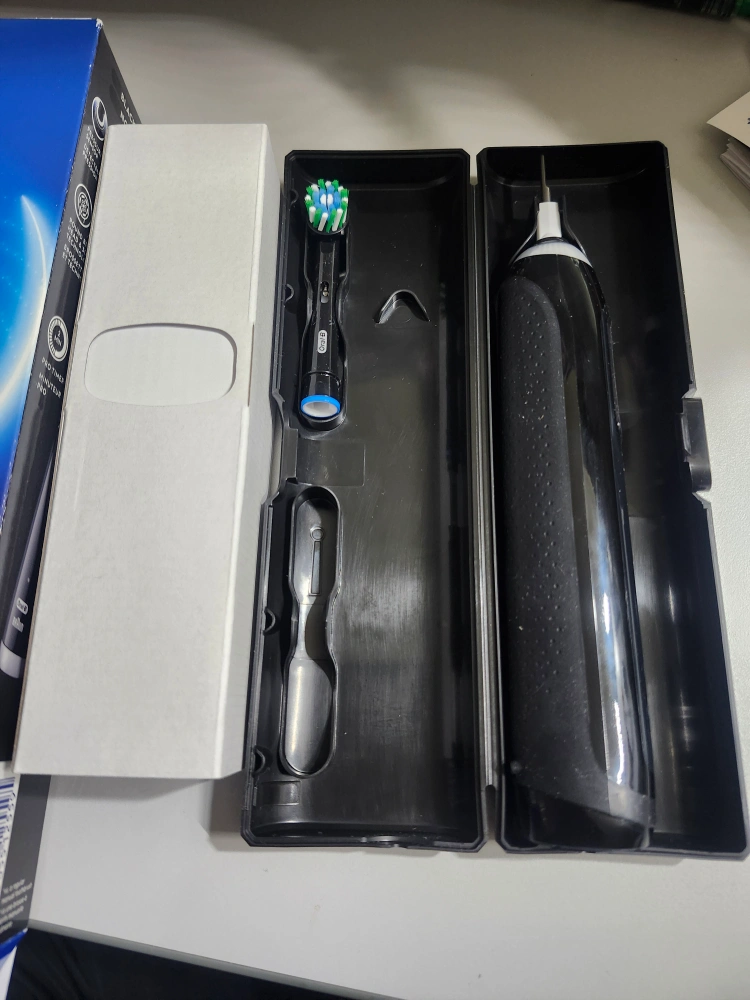 A sleek electric toothbrush and charging case. It appears to be in good condition. The case is perfect for travelling. Enjoy a fresh feeling by improving your oral hygiene.