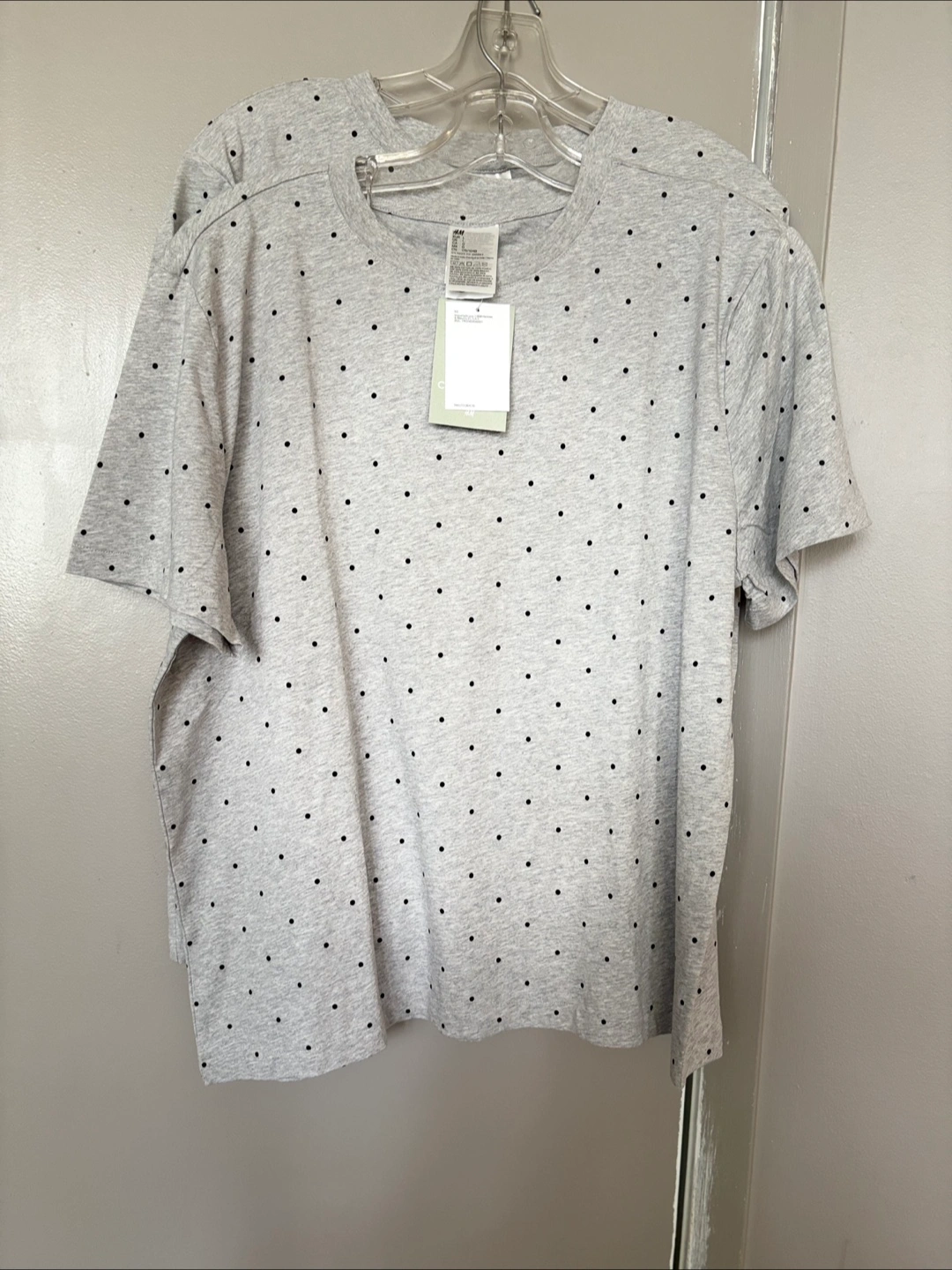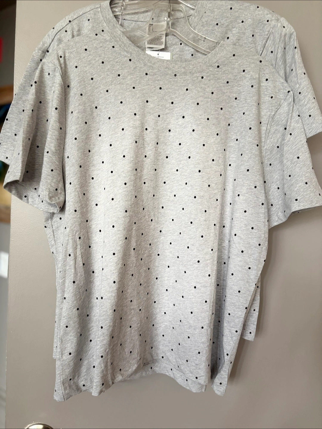 2 grey t-shirts. It is short-sleeved with a polka dot pattern. One with tag still attached. This top would be a simple addition to your wardrobe, creating a relaxed outfit.