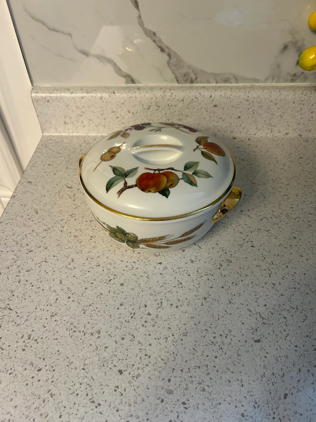 A beautiful serving dish. White with gold trim. Features fruit design on the lid and sides. It can be a lovely way to add charm to a meal.