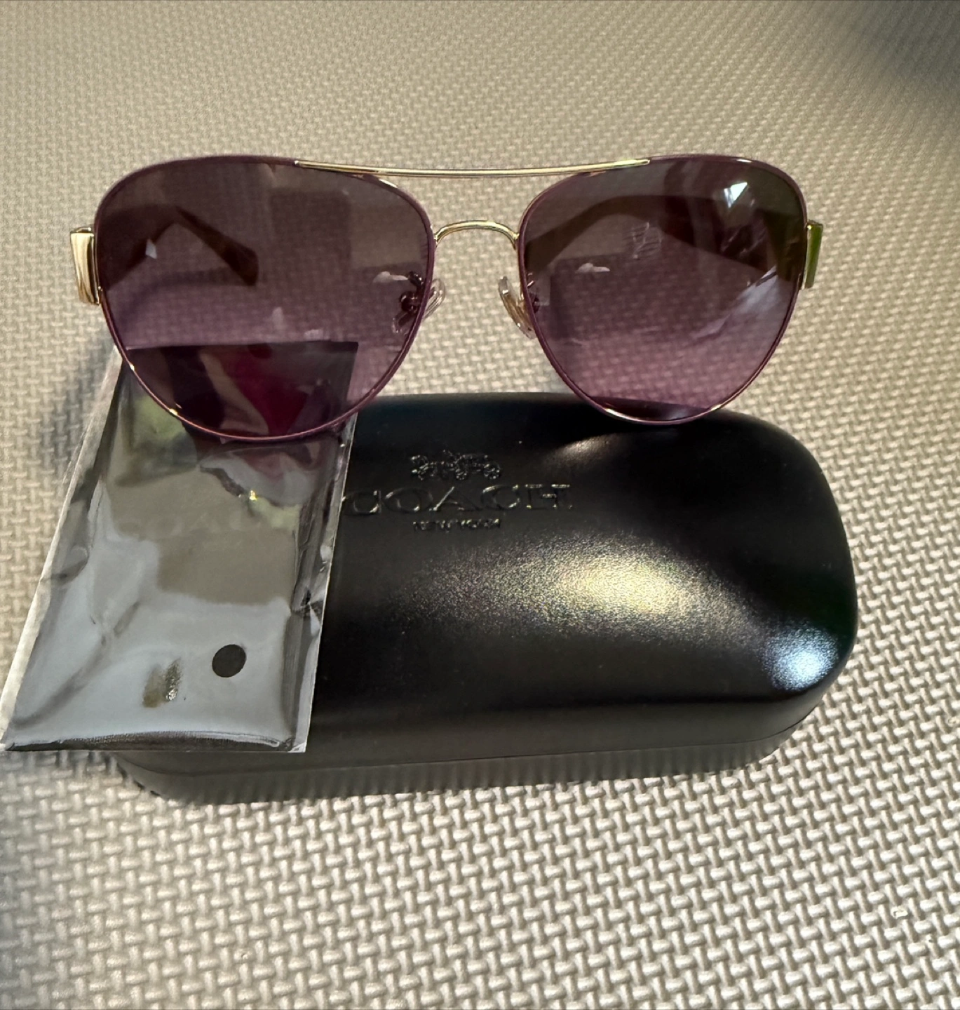 Make me an offer… Beautiful sunglasses with a stylish case. The glasses have a purple tint to the lenses. Their frames are gold-coloured. A perfect accessory to wear on a sunny day.
