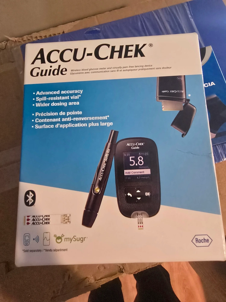 Accu-Chek Guide meter and lancing device. It comes in its original box unopened. . It measures your blood glucose. You will find it helps to bring you peace of mind knowing your glucose levels.