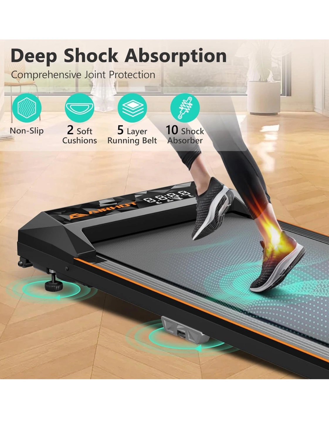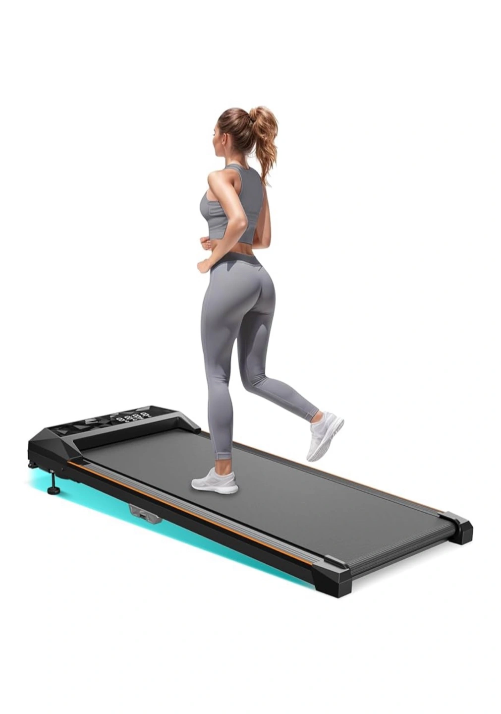 Multi-Use Portable Treadmill - Thickness of our compact treadmill is only 5'', which is easy to be stored under the sofa, desk or bed, making it a great space saver. This walking mat is equipped with transport wheels, and the machine weighs only 39 pounds. So you can easily move or lift it to any location you want.