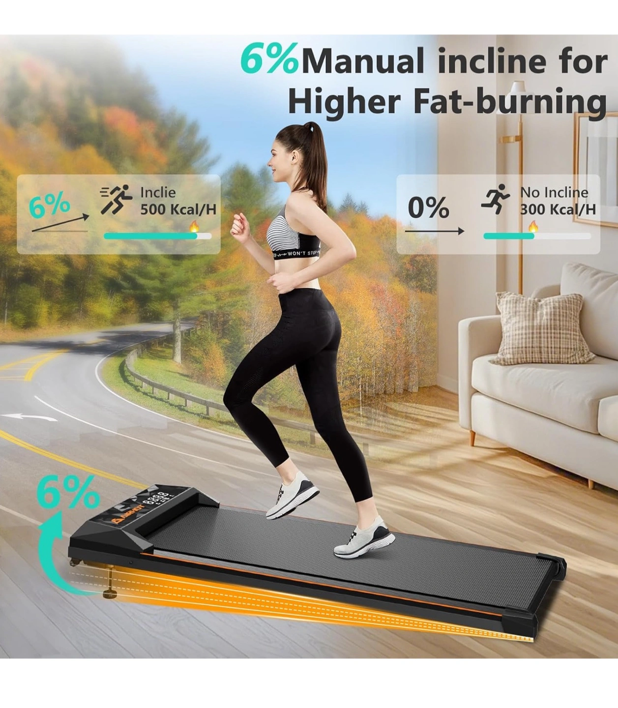 Manual Incline for Higher Fat burning - This walking pad under desk is designed with a 15°manual incline. Simply rotate the front footrest to turn on the lift to simulate a climbing effect more realistically and burn more calories. This compact treadmill has a height adjustment knob in the middle of the front, which you can turn to adjust to a comfortable height for a more stable exercise experience.