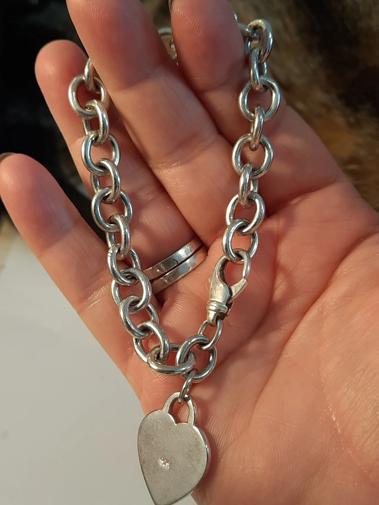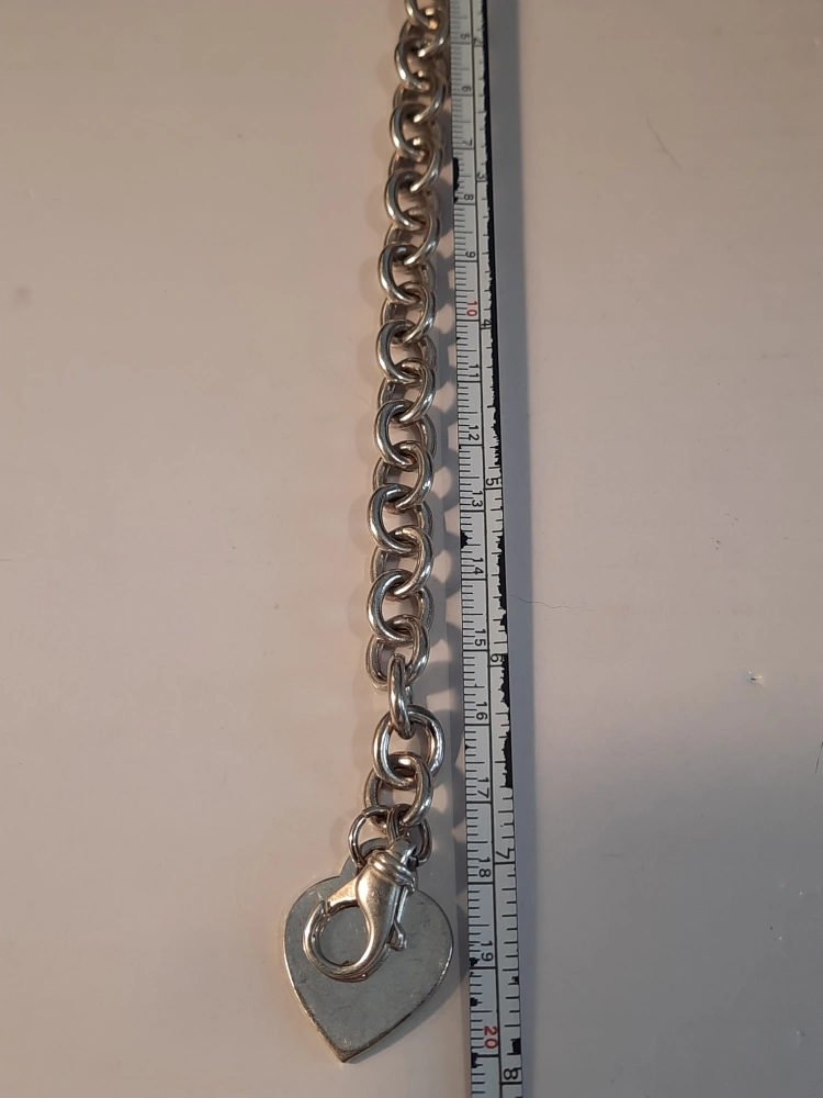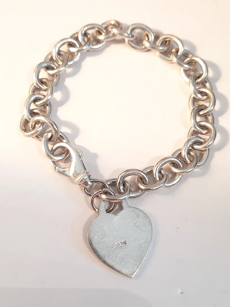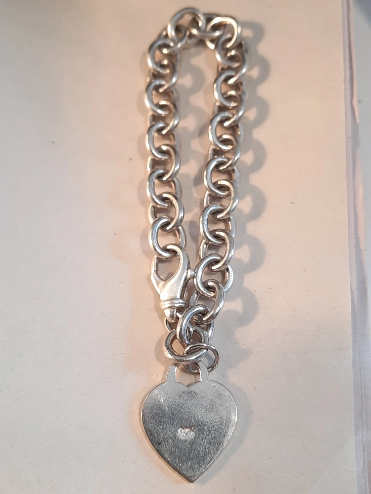 A silver 925 chain bracelet. Features a heart charm. It has a clasp. Wearing this bracelet can add a touch of elegance to your look.