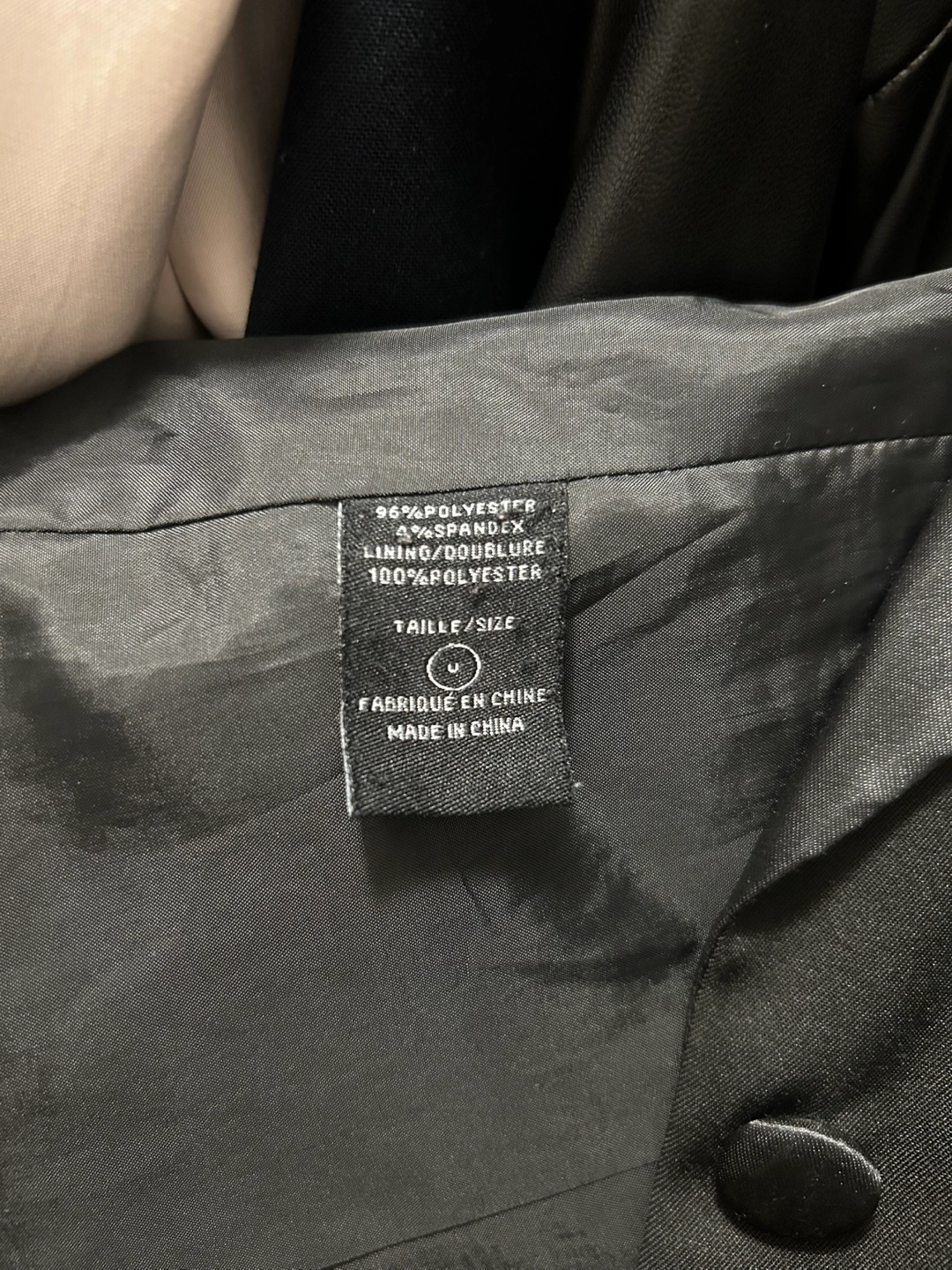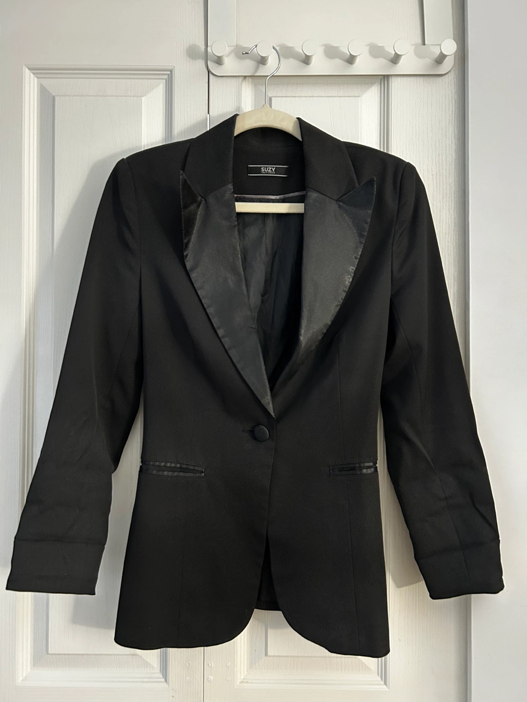 Black blazer. Has long sleeves that end with with small black buttons. Features a satin lapel. Could be worn on a night out or for work.