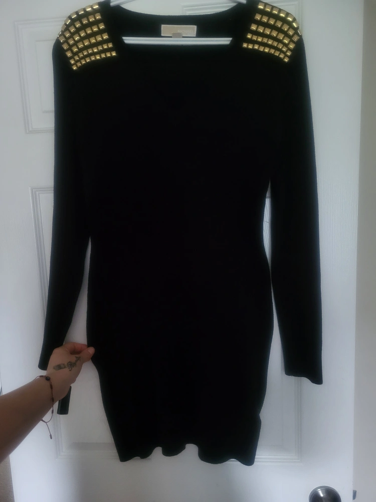 Long sleeve dress. Features gold studs on the shoulders. Round neck. Perfect for a night out.