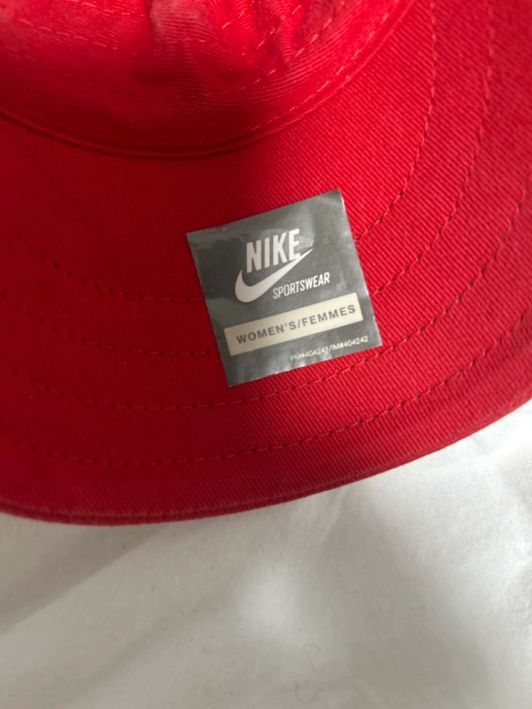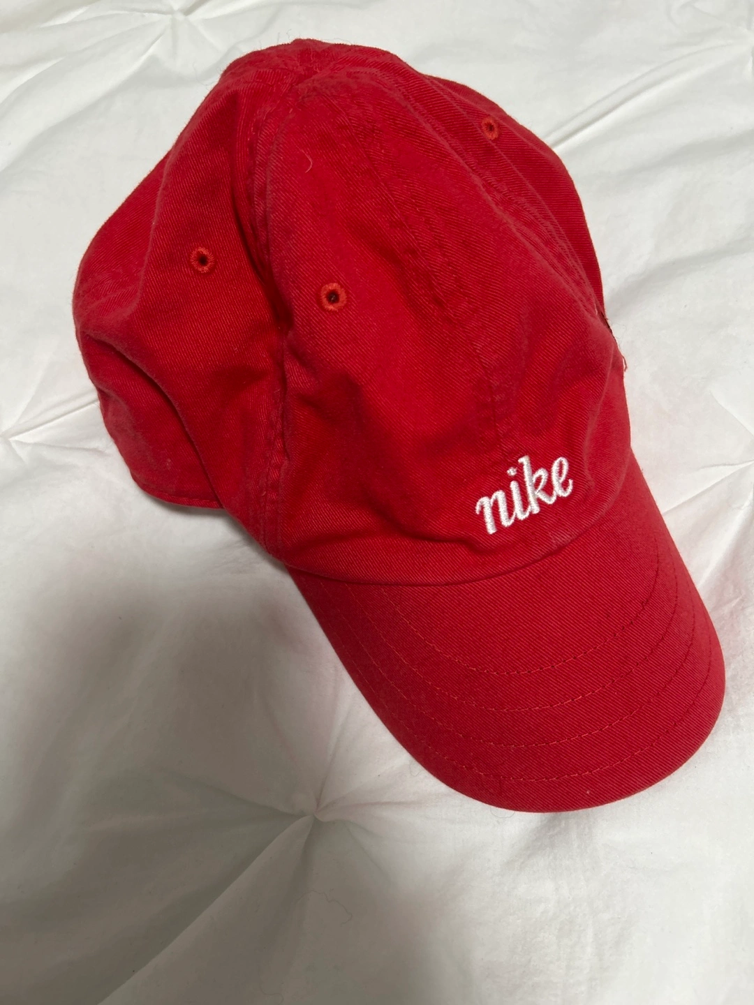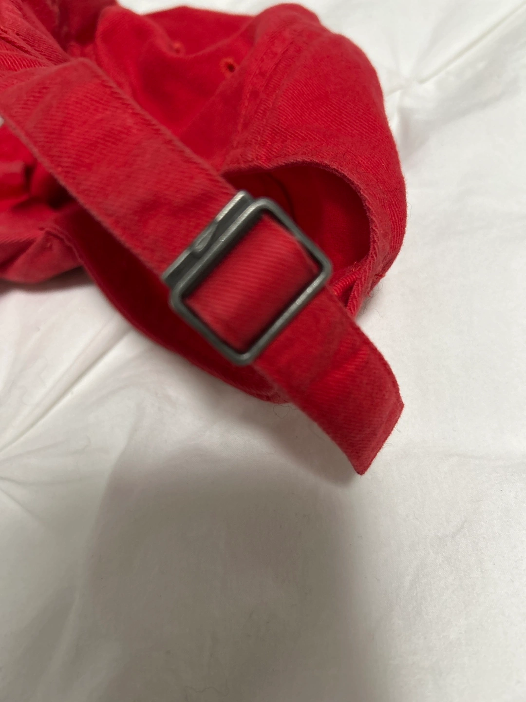 A simple red cap with a curved brim. Features an adjustable strap in the back with a metal buckle. Perfect for a sunny day stroll, allowing for a bit of quiet reflection.