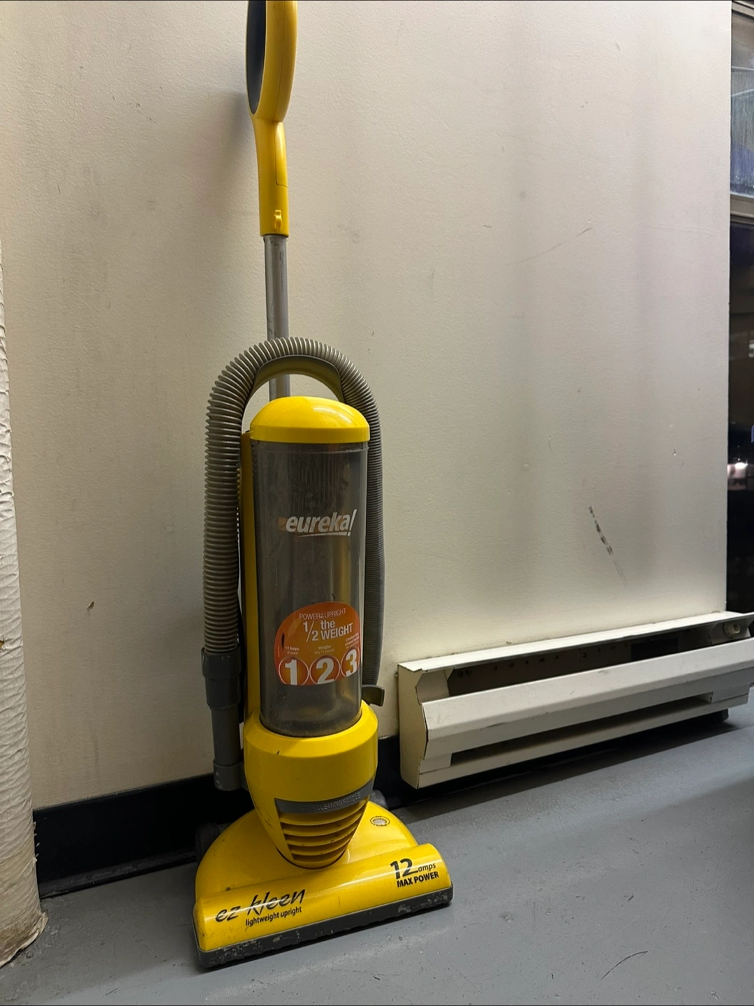 A yellow and grey upright vacuum cleaner. Features a handle, hose, and a see-through dust container. A great way to clean your home quickly and efficiently, so you can enjoy a relaxing evening. Works well. Did quick clean.