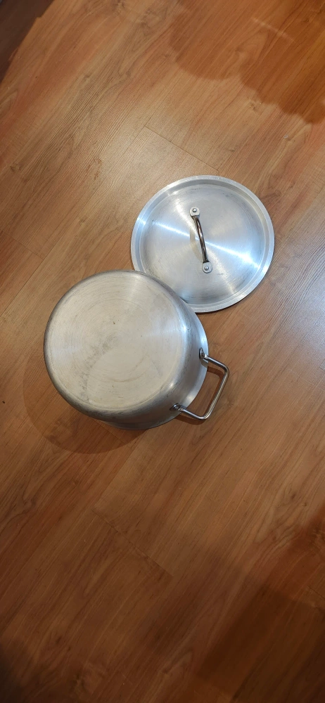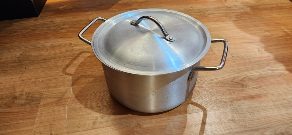 Aluminum pot with a lid. Includes two handles on the side and a handle on the lid. Metal finish. A wonderful choice for simmering a hearty stew in the comfort of your home. excellent condition price only cash only pickup no delivery meet up 801 O'Connor Drive East York outside TD Canada Trust bank door.