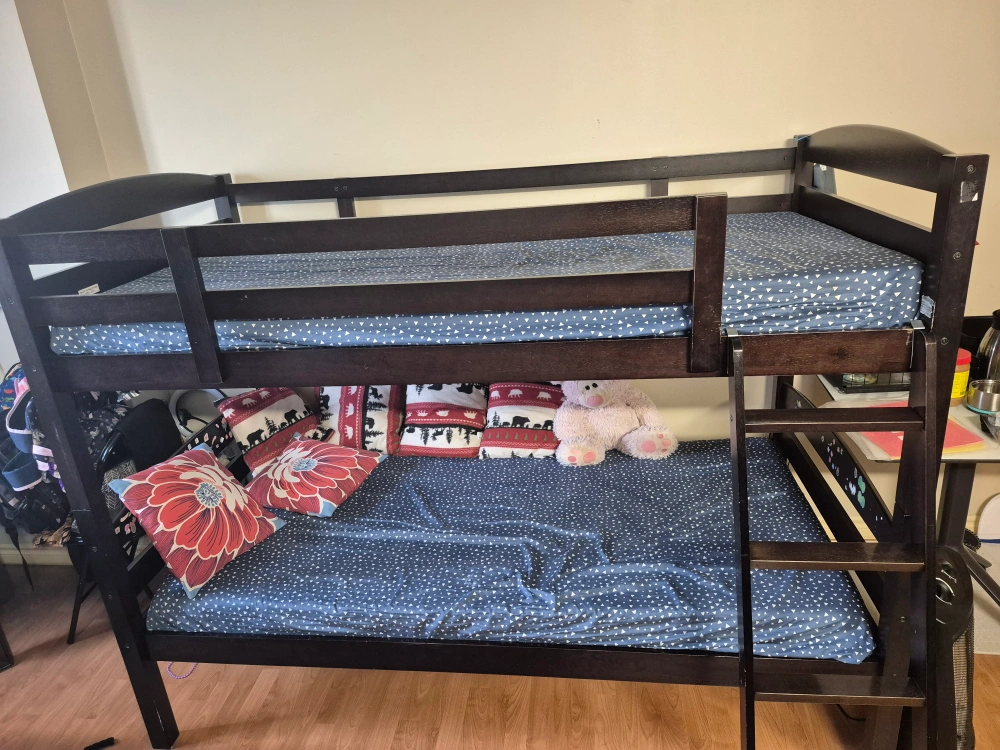A bunk bed featuring a dark brown frame. Includes a ladder for easy access to the top bunk. bought it for 900 just 7 months ago. easy to assemble and pickup.