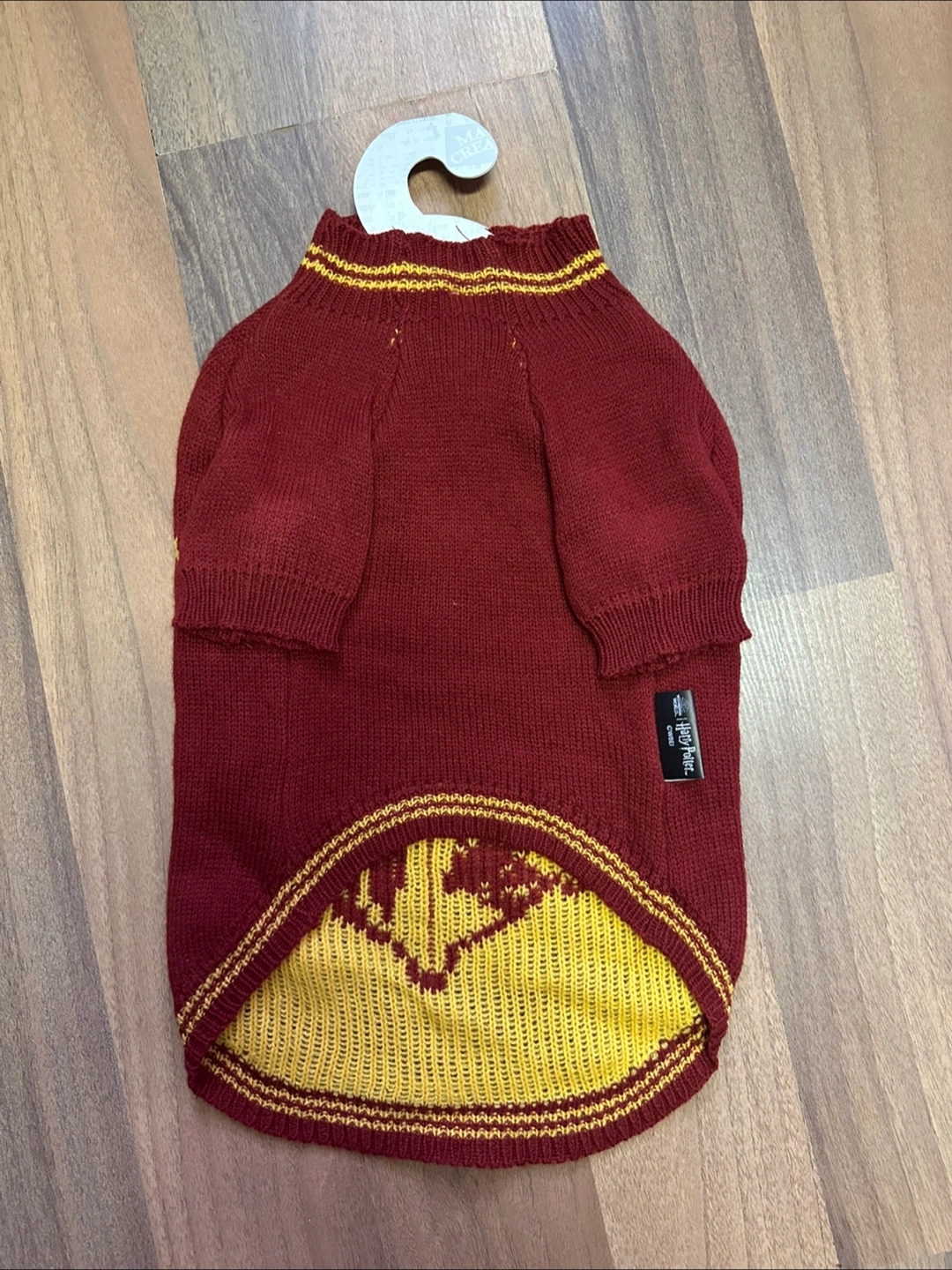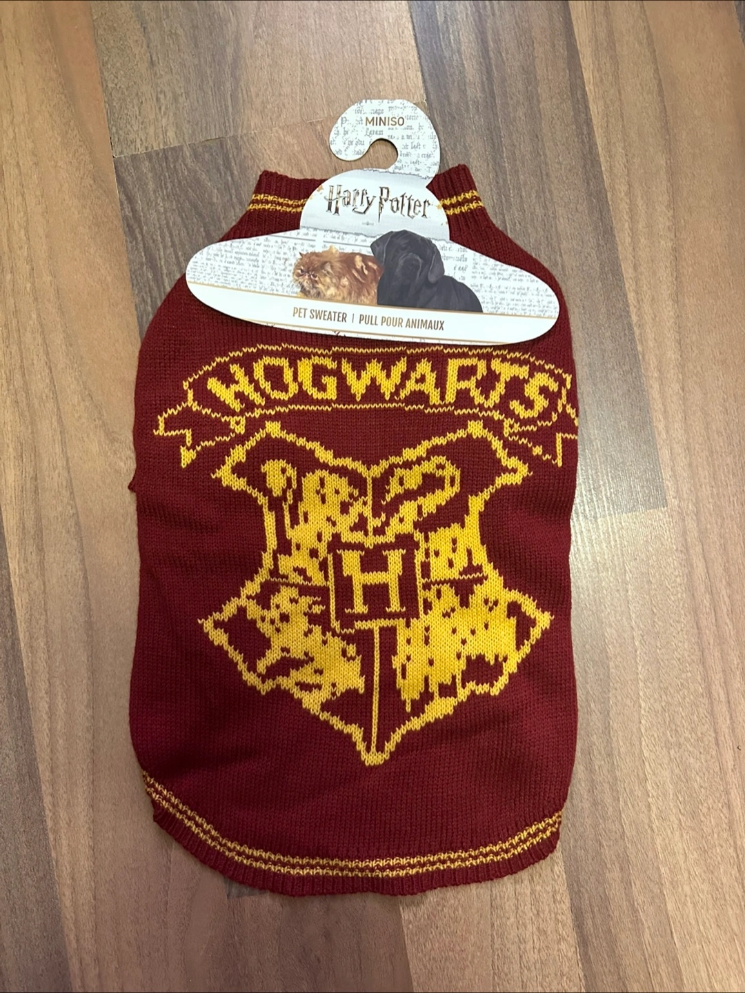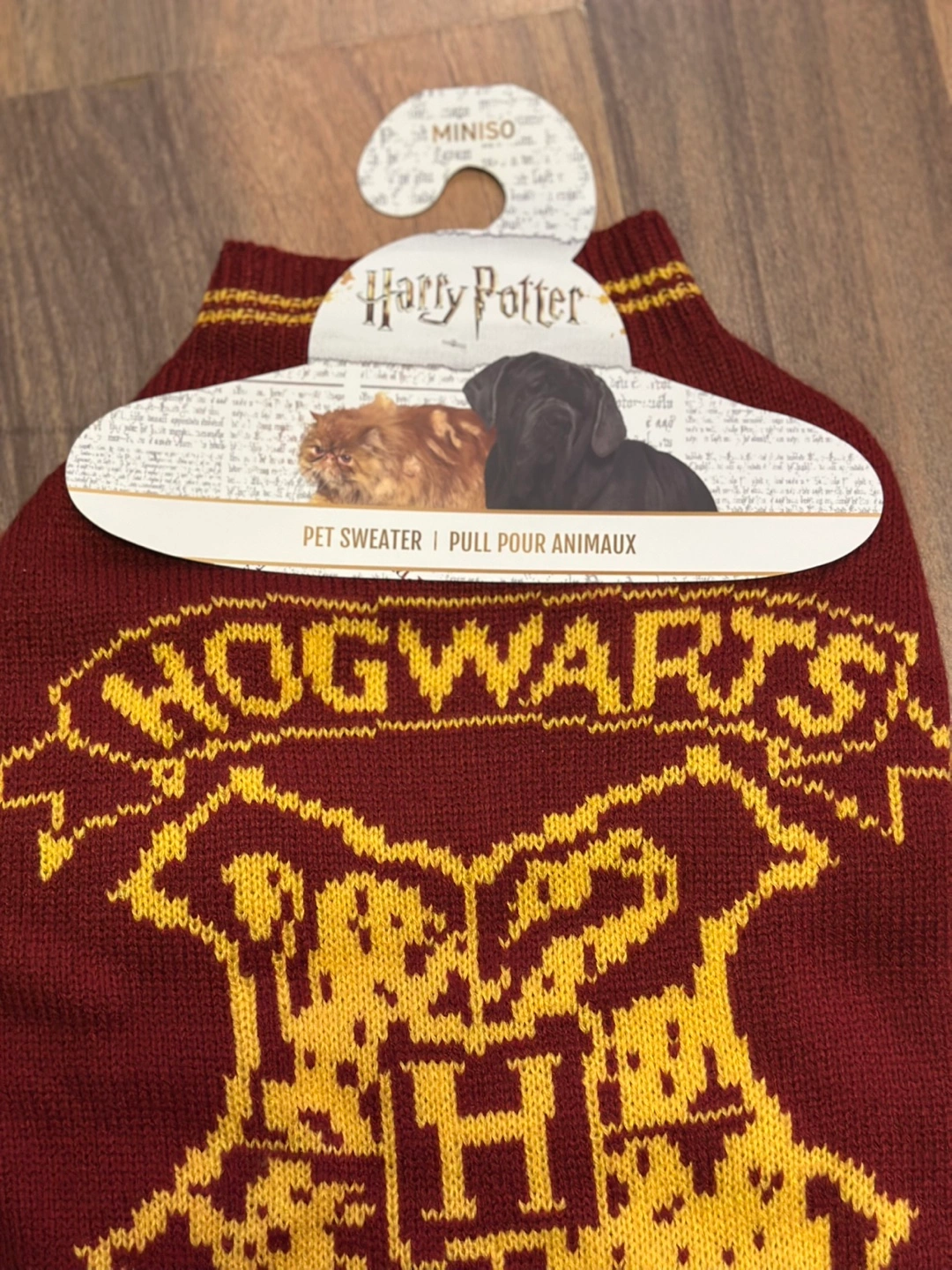A cozy, knitted pet sweater. It features the Hogwarts crest. A perfect item for your fur baby to stay warm this winter season. Purchased from Miniso.
