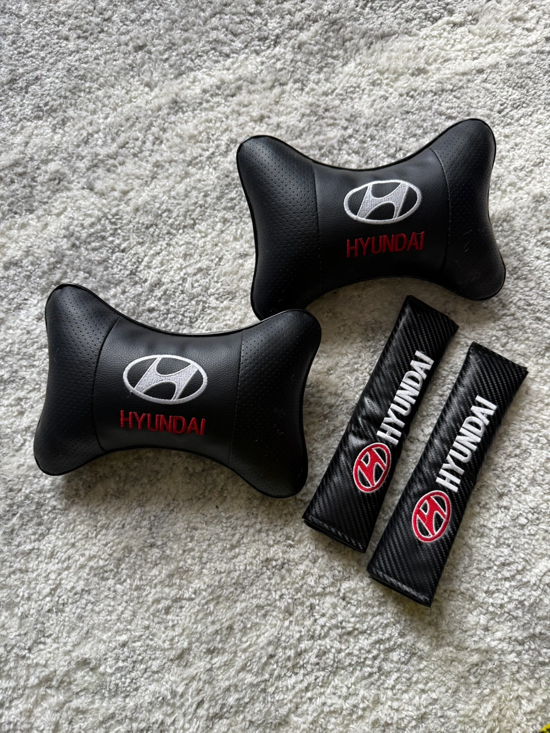 A set of car accessories. Included, headrest pillows and seatbelt covers. The items are black with white and red detailing. These accessories would bring a comforting feel to any car ride.