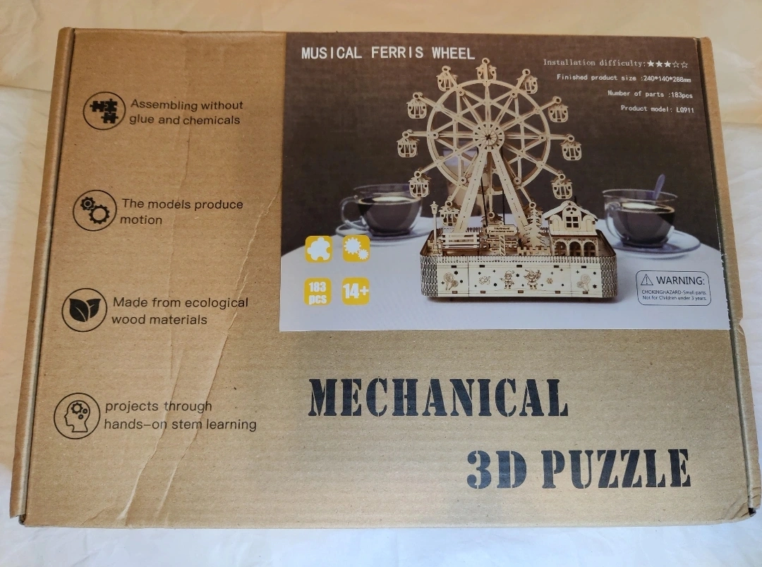 A wooden mechanical 3D puzzle. It has 183 pieces. The finished product is a Ferris wheel. It has a music box feature. Taking some time to build this can be a great way to unwind after a long day.