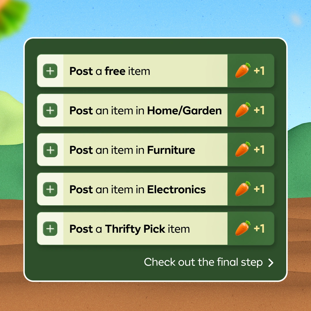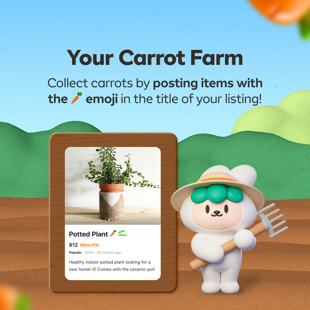 1000+Hey Karroters, Summer is right around the corner! It’s the perfect time to clear out the clutter and freshen up your space. Join us in this week's “Collect the Carrots” challenge and let's add some fun into your declutter routine ✨. From June 13-19 you can collect carrots by posting items for a chance to win a prize! Prizes: 🥕Collect 5 carrots - $100 Amazon gift card for 10 winners 🥕Collect 3+ carrots - $50 Amazon gift card for 10 winners 🥕Collect 1+ carrots - $10 Amazon gift card for 10 winners Collect carrots by posting items with the 💚 emoji in the title of your listing Post a free item 🥕 +1 carrot Post an item in Home/Garden 🥕 +1 carrot Post an item in Furniture 🥕 +1 carrot Post an item in Electronics 🥕 +1 carrot Post a Thrifty Pick item (priced below the AI suggested minimum price) 🥕 +1 carrot Here’s how it works: 1. Post items between June 13-19 with the 🥕 emoji in the title of your listing 2. You may only complete each category only once (eg. posting 5 furniture items does not equal 5 carrots) 3. Leave a comment below to confirm your entry. Prize winners will be randomly chosen and announced on June 20th. Best of luck to all participants and let’s start collecting 💚. Terms and Conditions - Only posting made between June 13 0:00 - June 19 23:59 will be counted as valid entries. - Users can only complete each task once. Completing the same posting category multiple times will not result in more carrot points. - This promotion is only open to signed up & verified users in the US. - Winners will be chosen randomly & announced as an in-app post on June 20th.