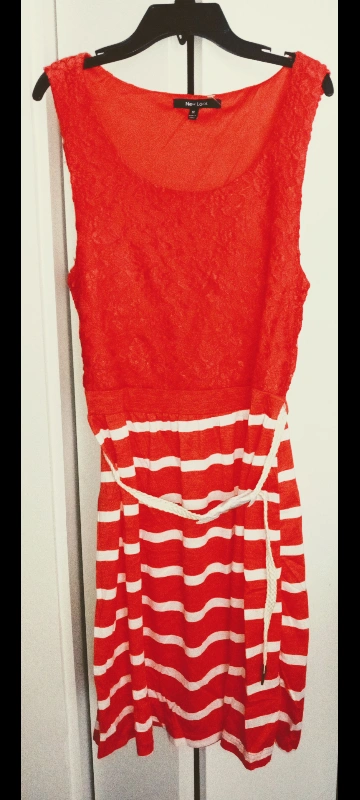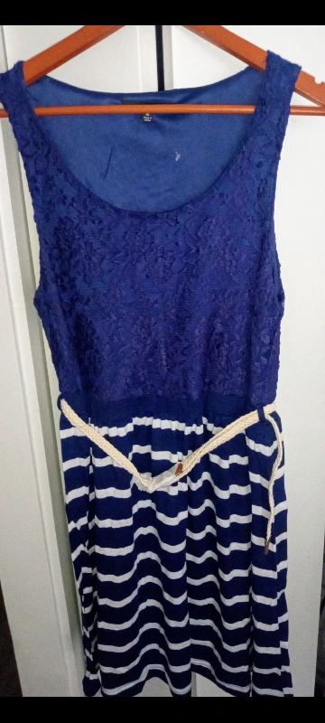 36Features a round neck and a lovely lace design on the bodice. The skirt is patterned with horizontal stripes and it has a waist-tie belt. Wearing this dress would be the perfect addition to a relaxing summer day.
