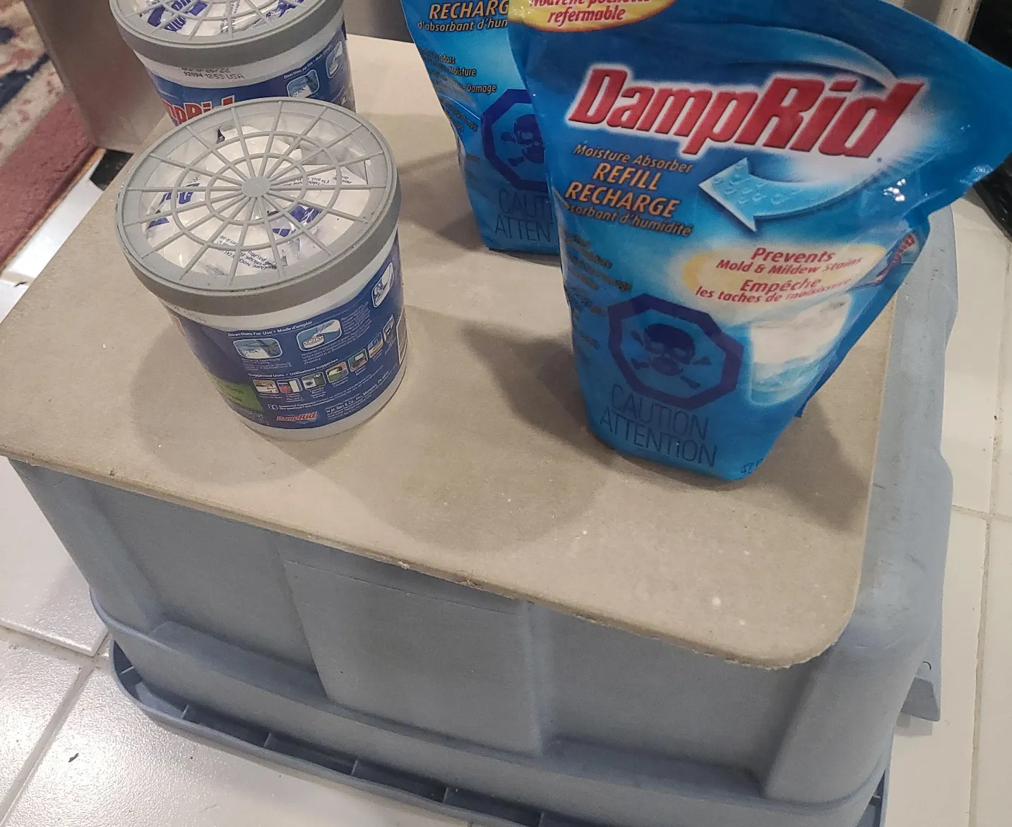 Listing includes a moisture absorber refill and a container. Packaging appears to be sealed. Use these items in a space to reduce humidity levels, which can lead to a more comfortable home environment.
