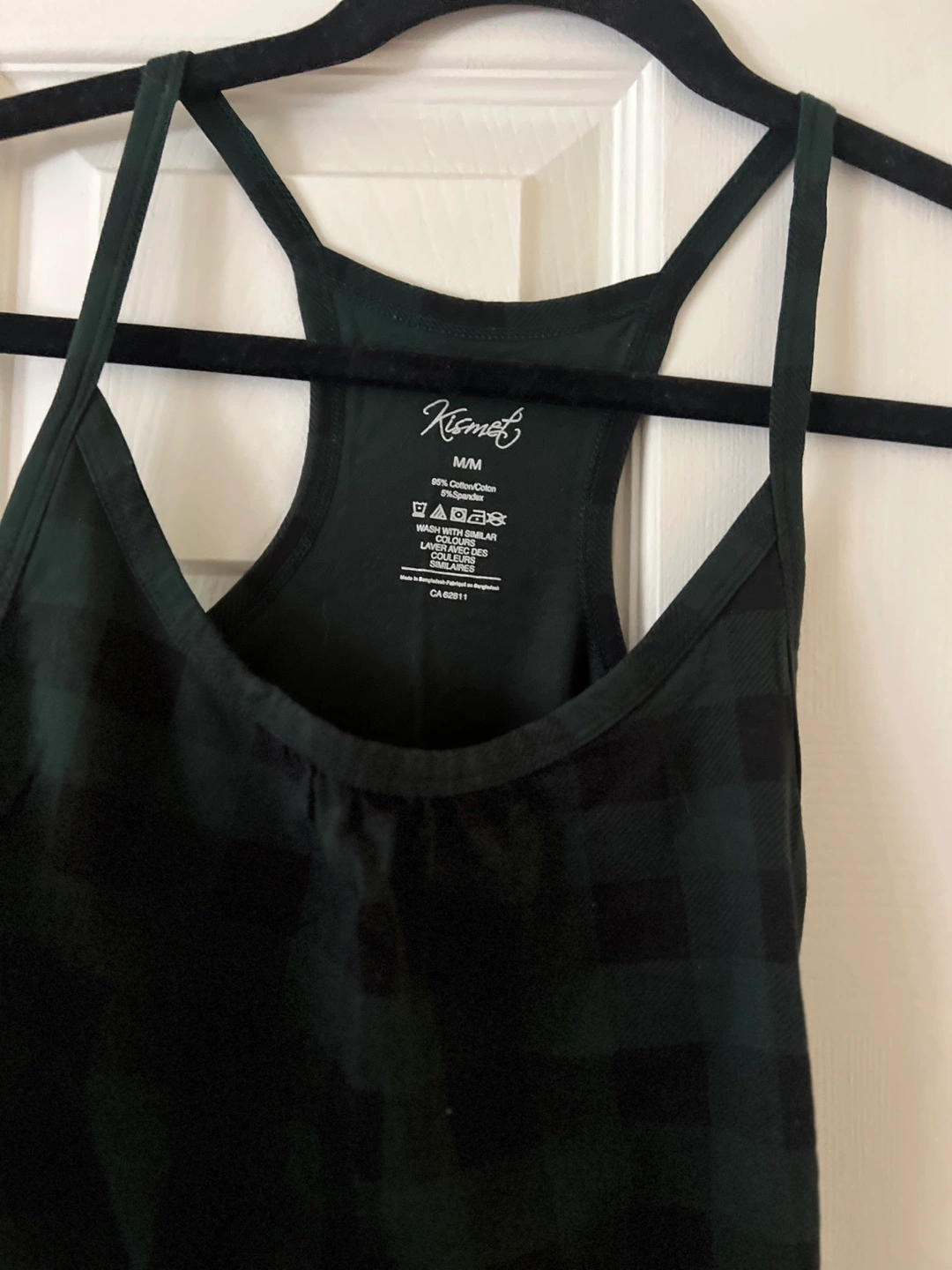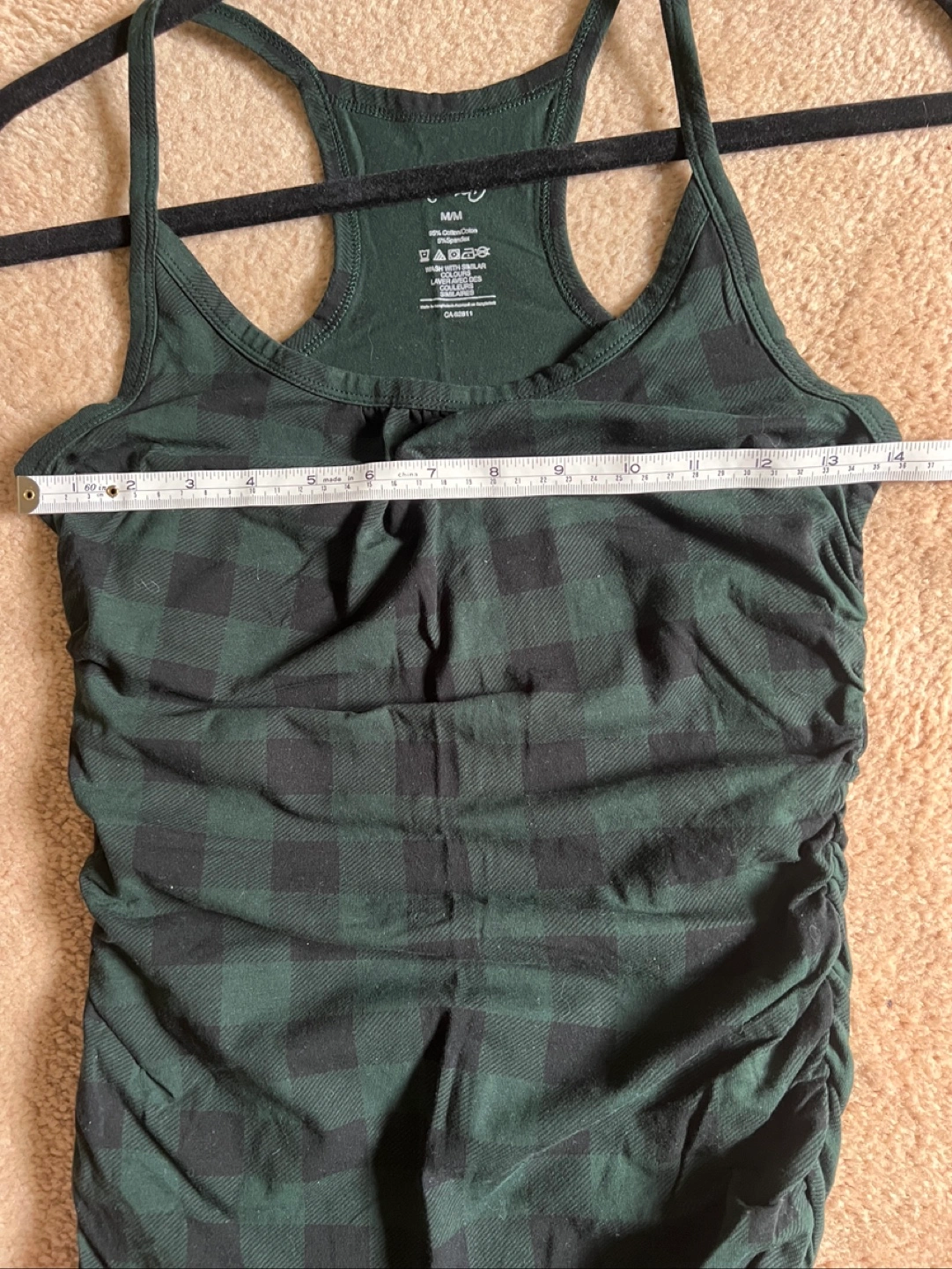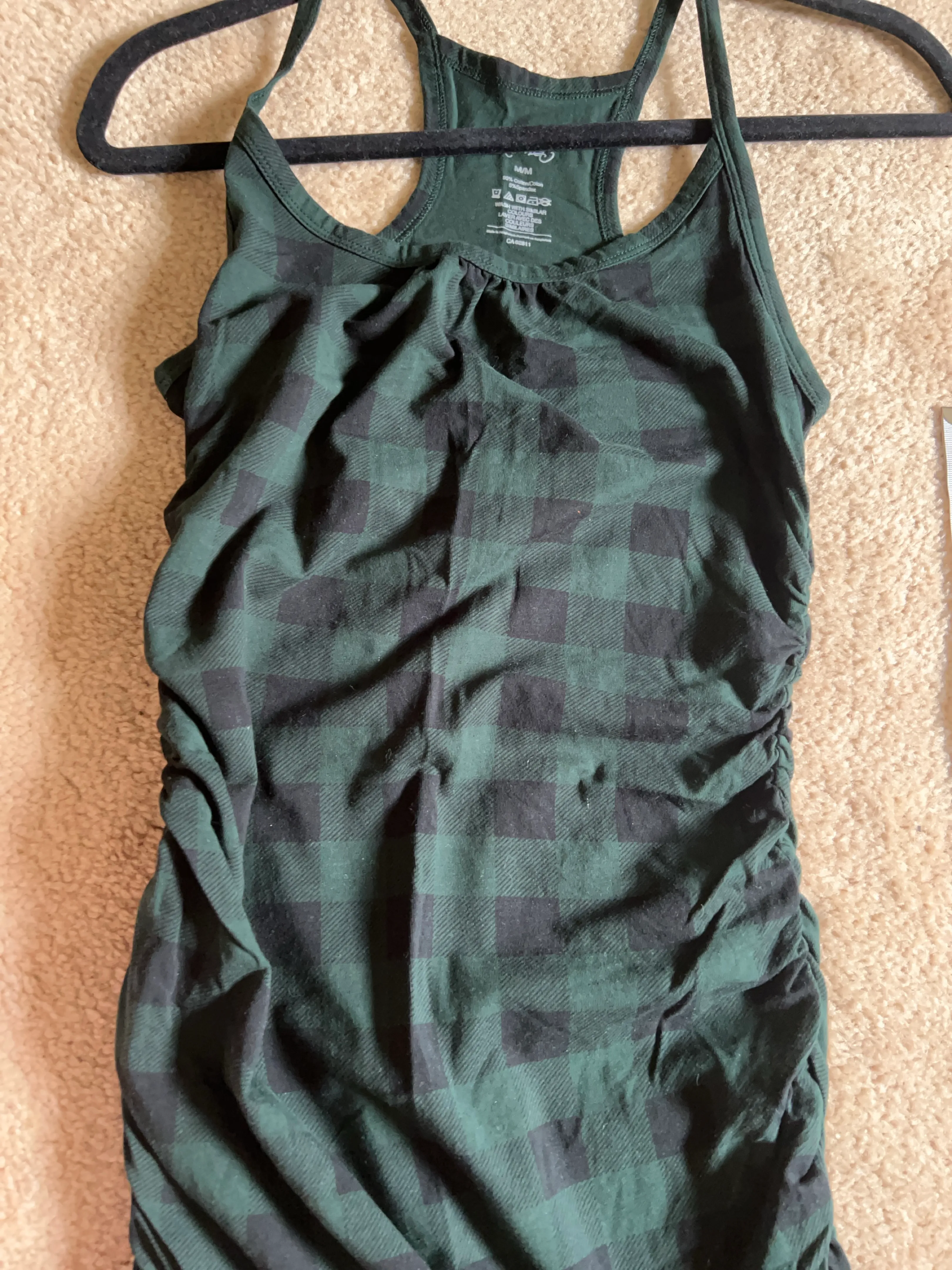 Tank top with a green and black plaid pattern. Features a racerback design with thin straps. With ruching on the side seams. Consider wearing it on a cozy night in.