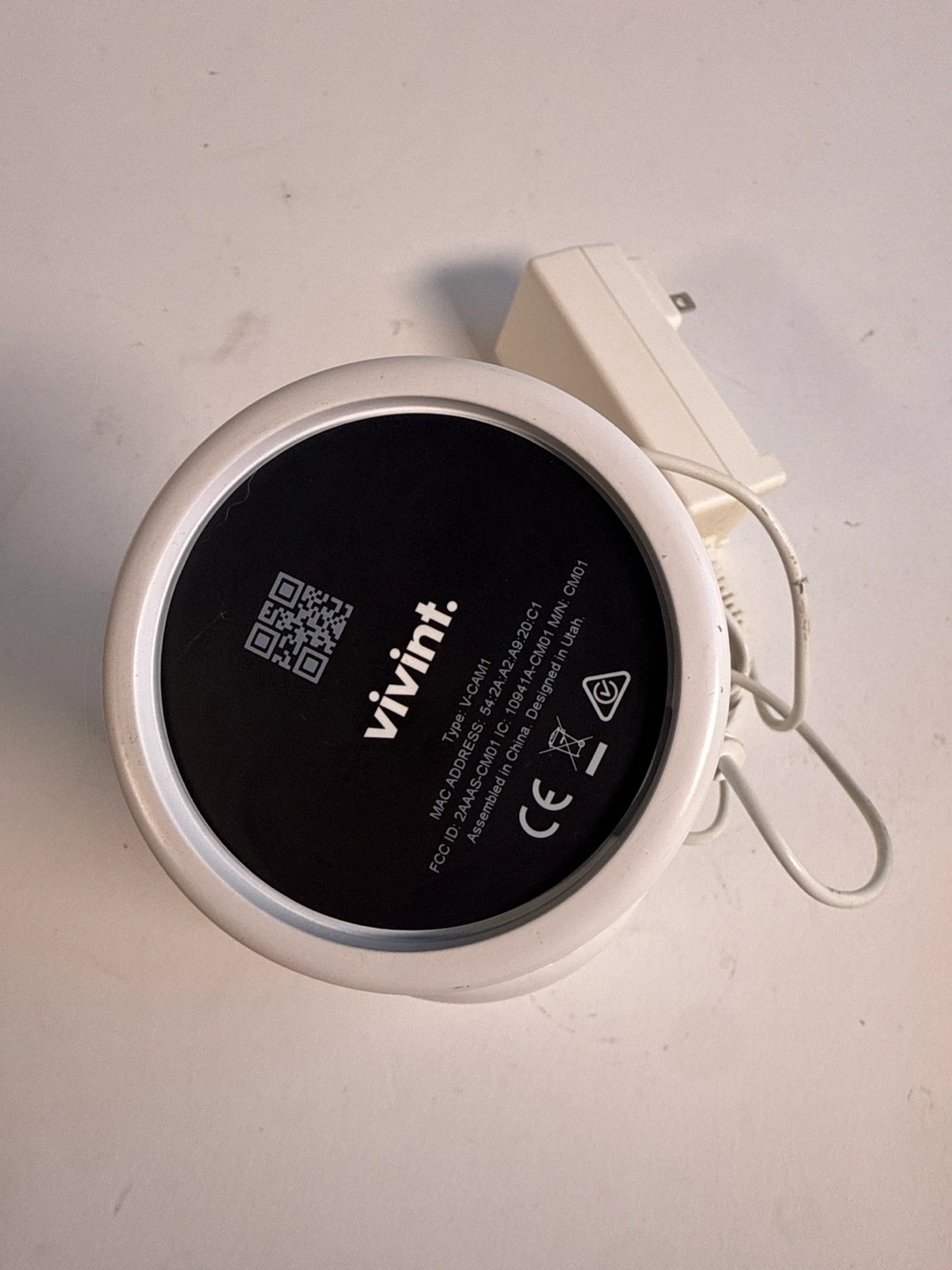 White camera on a round base. The top is circular. The base is labeled with the brand name. It is a great way to stay informed about what's happening around your home with peace of mind.