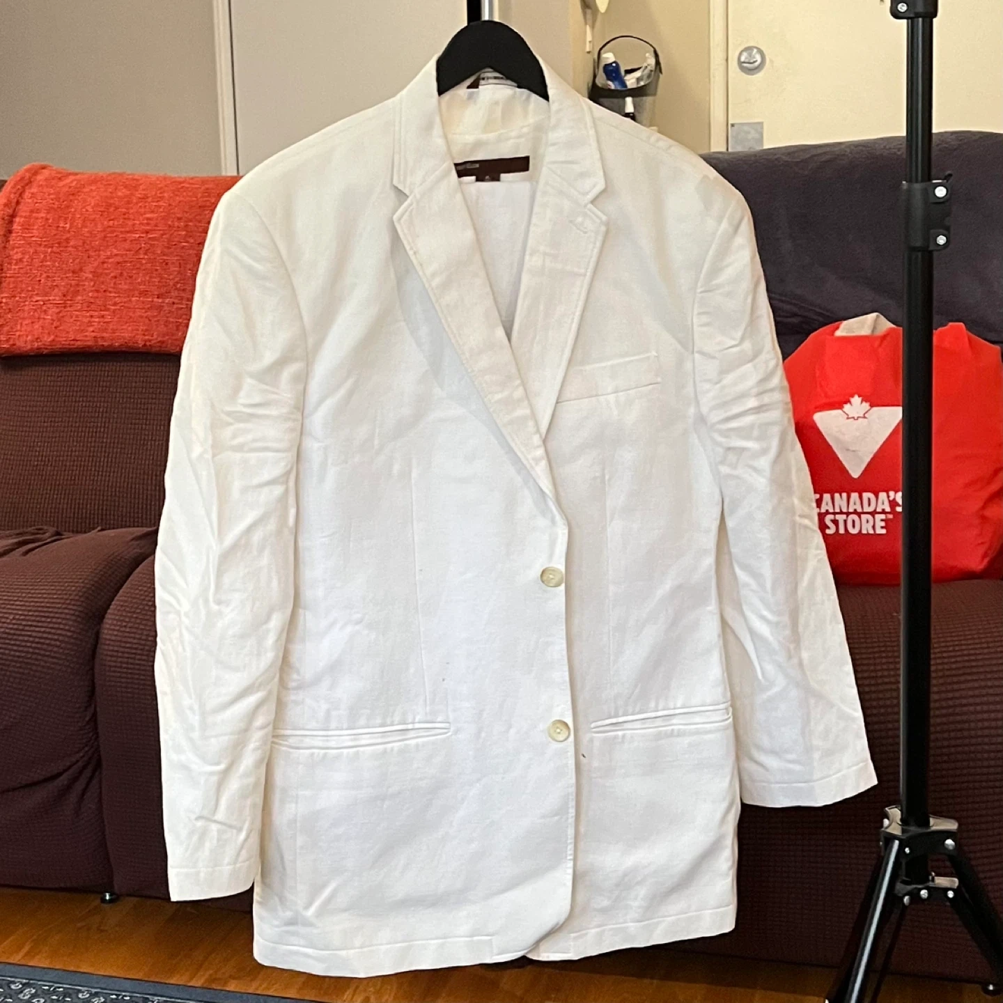 A classic white blazer with a linen blend fabric. It features two buttons at the front and two flap pockets. Perfect for layering over tops.