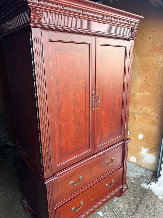 This solid wood armoire is a beautiful and functional piece, perfect for adding storage and style to any bedroom or living space. It is composed of two separate pieces stacked on top of each other. This armoire is in good condition and has been well-maintained. It's ready to be a functional focal point in your home with its timeless appeal and sturdy construction. I'm pricing it at a fair market value. It's still available if you're seeing this ad. Pick up only!